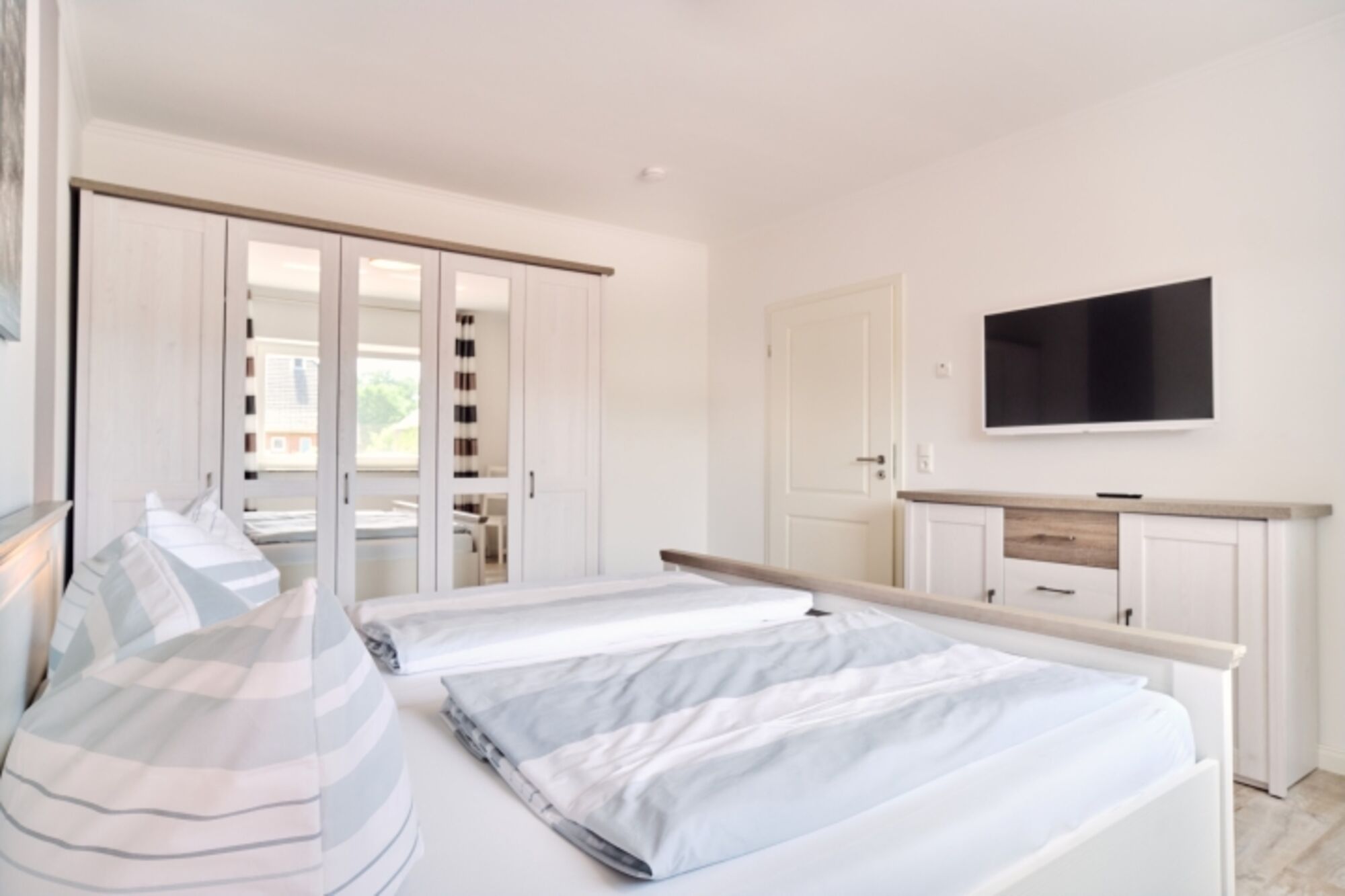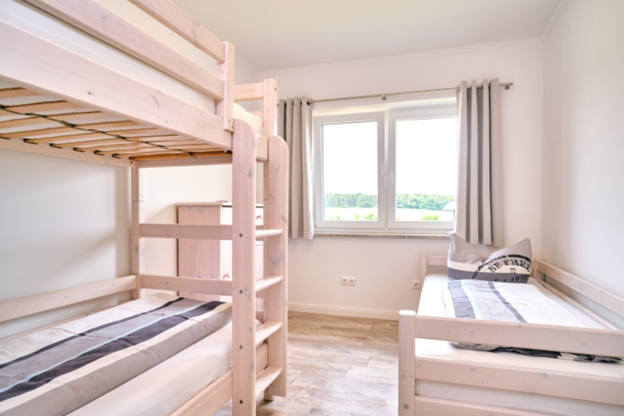 Drei Schlafzimmer sind mit jeweils einem Doppelbett ausgestattet, wobei in einem Schlafzimmer zusätzlich die Benutzung eines vorhandenen Querklappbettes möglich ist. Ein viertes Schlafzimmer wurde mit einem Einzelbetten eingerichtet und einem Doppelstockbett, sodass unser Ferienbungalow insgesamt genügend Platz für bis zu zehn Personen bereithält. Desweiteren steht ein Kinderreisebett sowie ein Kinderhochstuhl für Sie zur Verfügung.