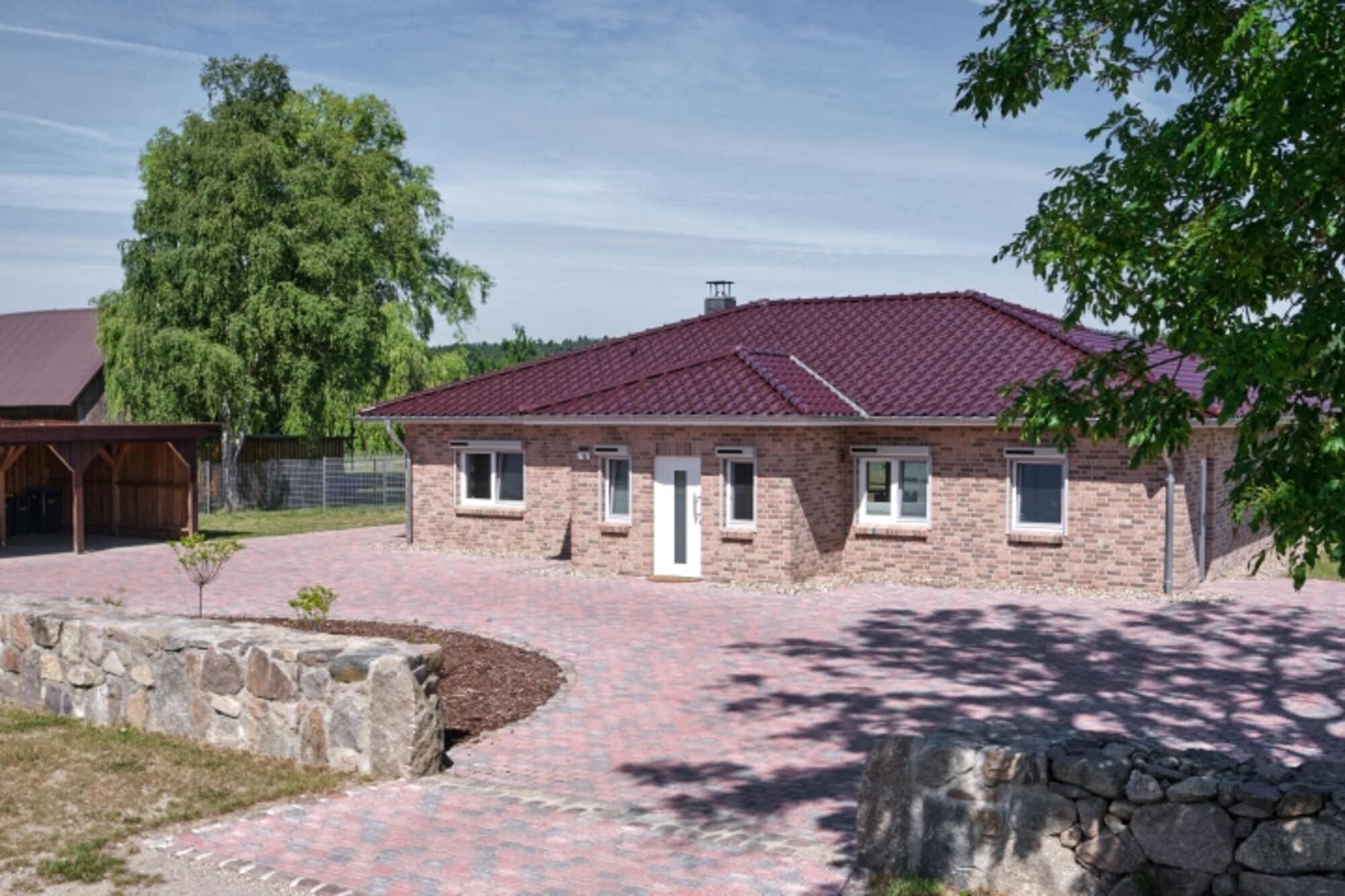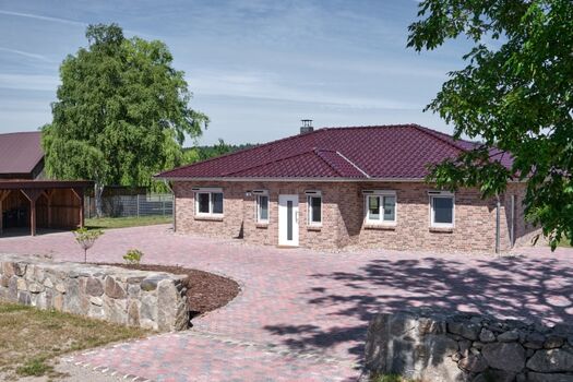 Am Haus befindet sich ein Carport mit drei Stellplätzen. Weitere Parkmöglichkeiten sind selbstverständlich auf gepflasterter Fläche vor dem Haus vorhanden. Die schwach befahrene Straße ist ca. 20 m vom Bungalow entfernt und durch eine Steinmauer vom Grundstück getrennt.
