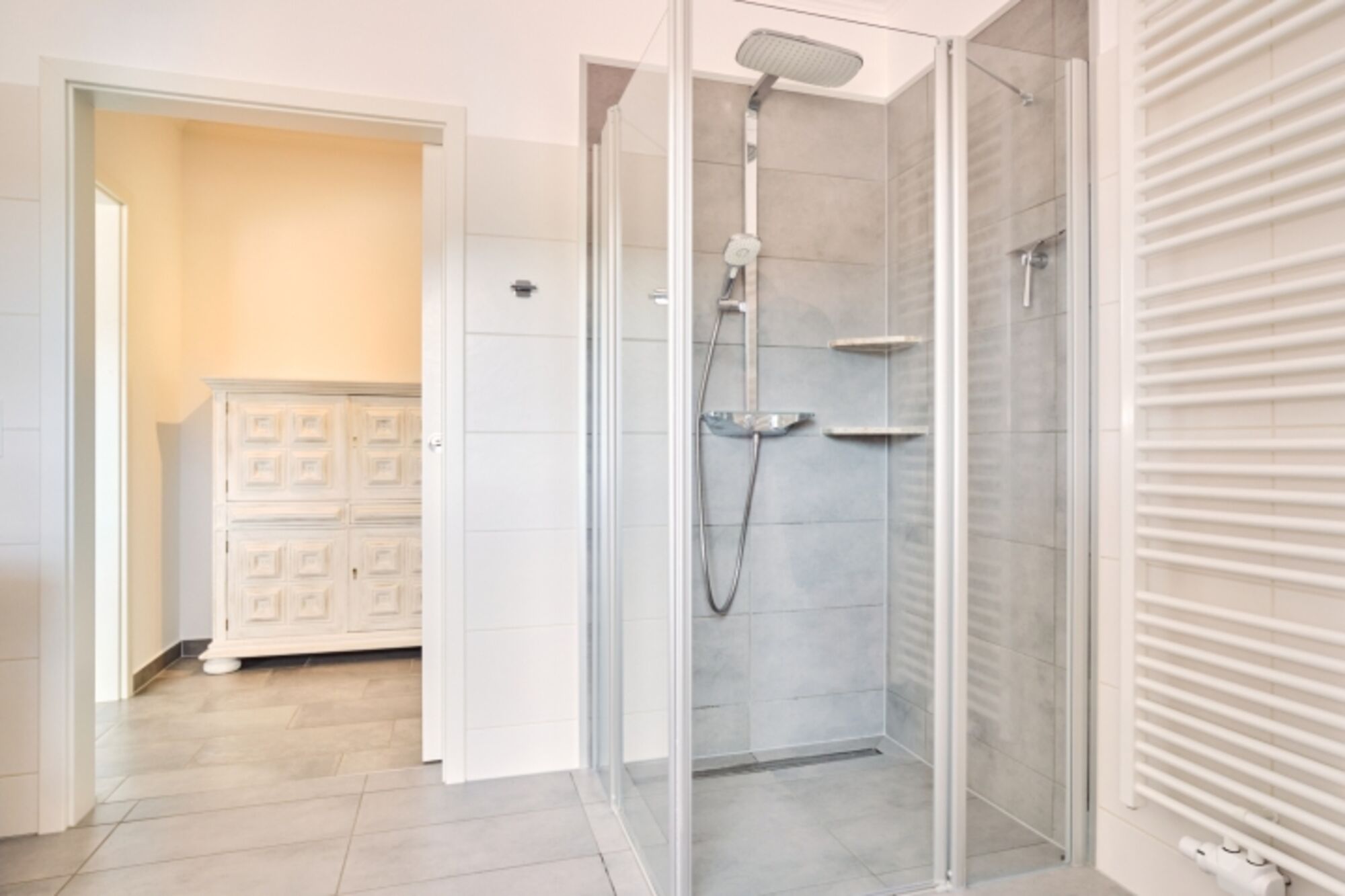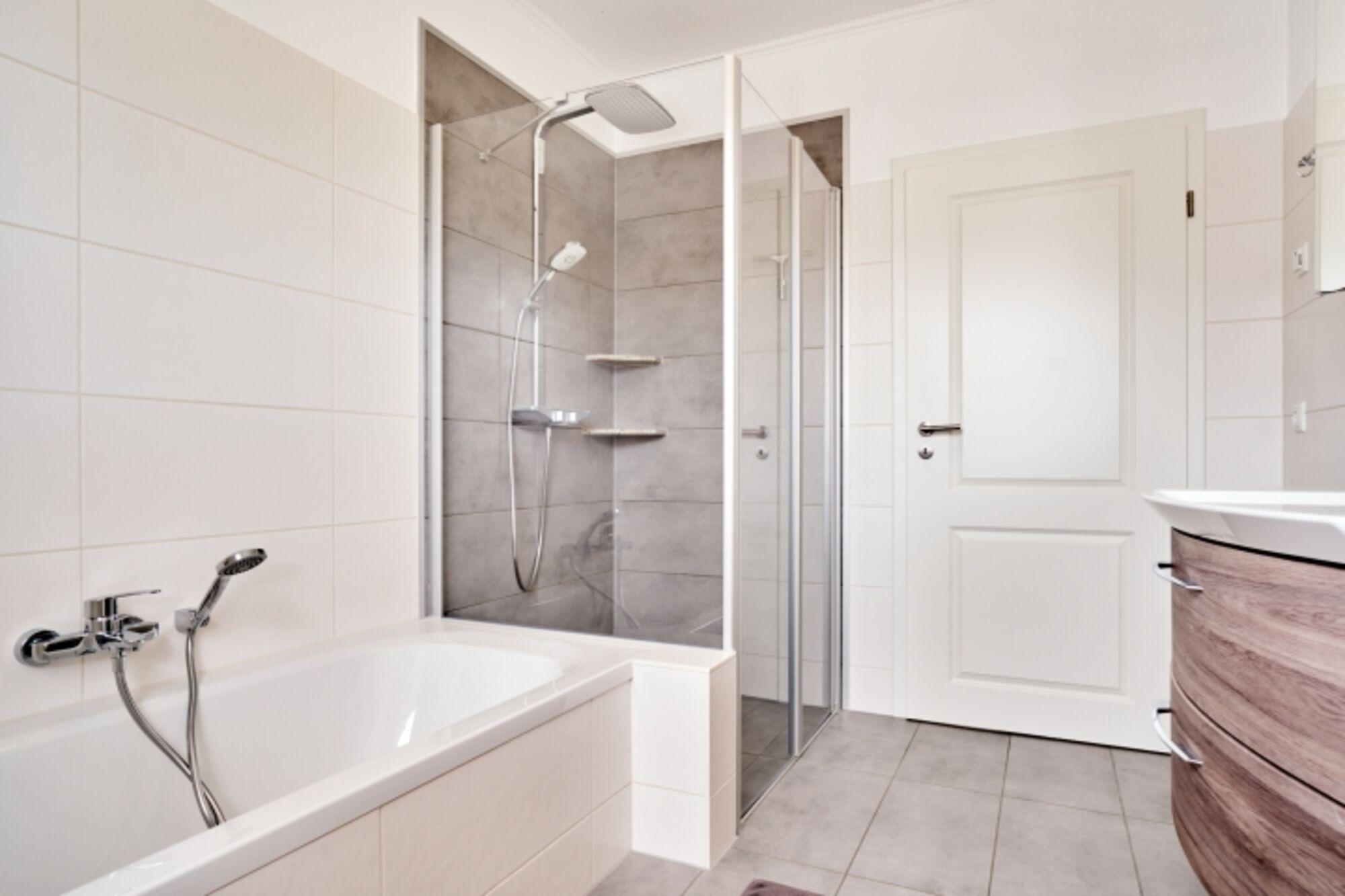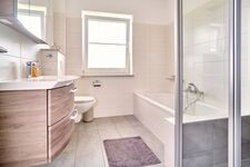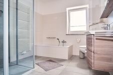 Auch die hochwertig eingerichteten Badezimmer mit Regendusche, jeweils einer Badewanne, einem WC und Fußbodenheizung lassen keine Wünsche offen. Das Licht kann stufenlos gedimmt werden - so haben Sie die Möglichkeit ein Bad in entspannter Atmosphäre zu genießen. Zusätzlich gibt es ein Gäste-WC und einen Hauswirtschaftsraum mit Waschmaschine und Trockner.