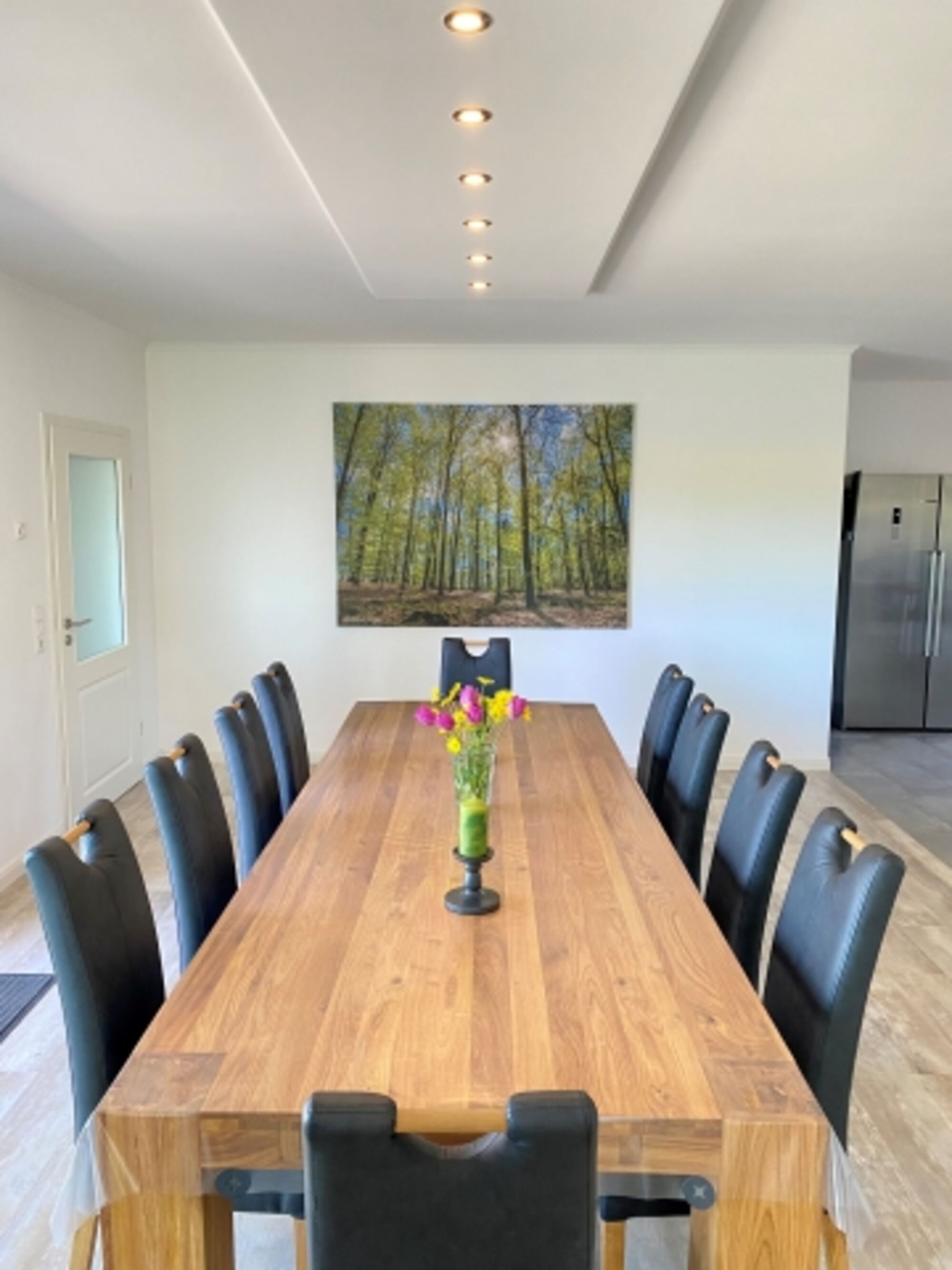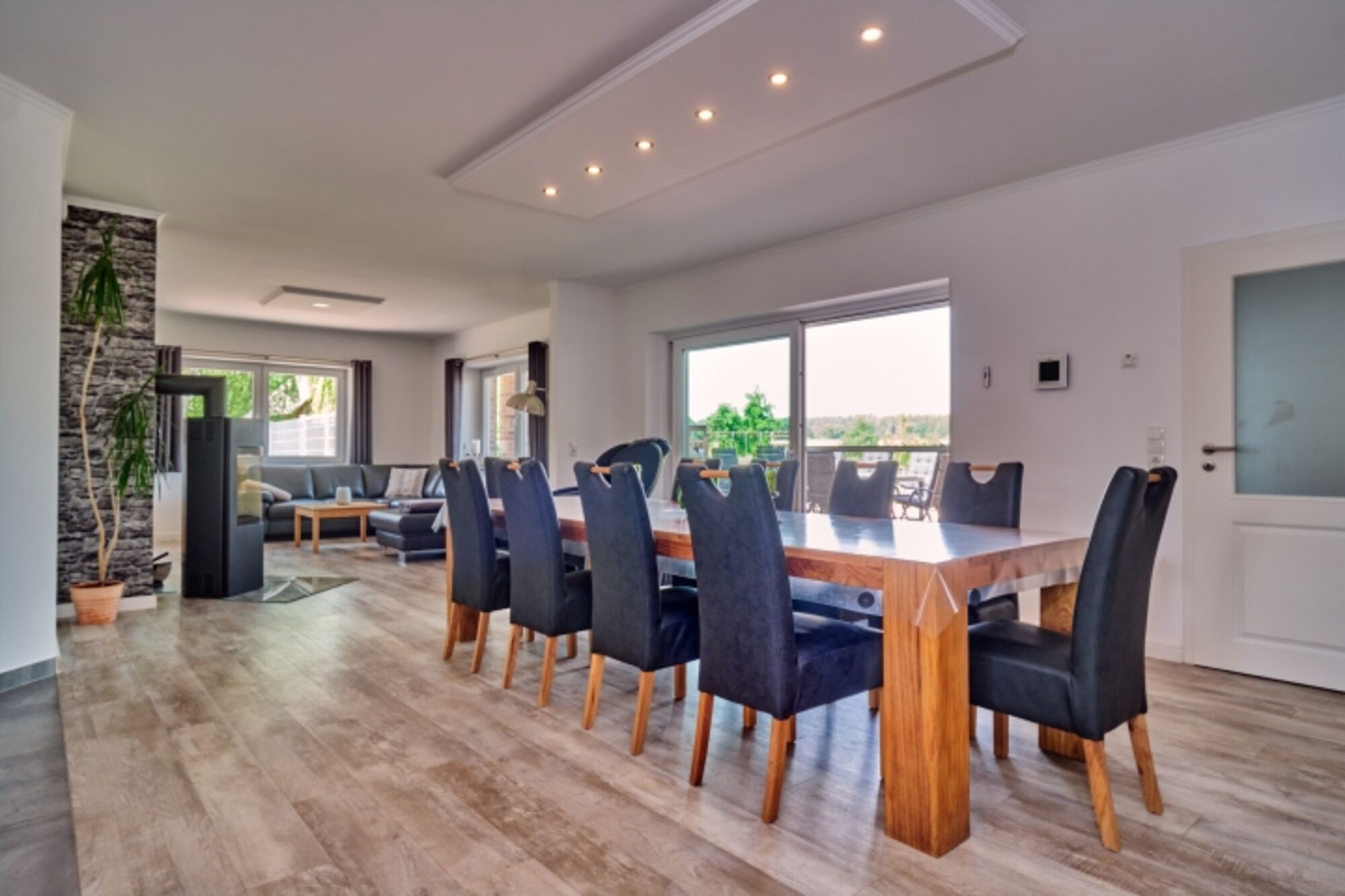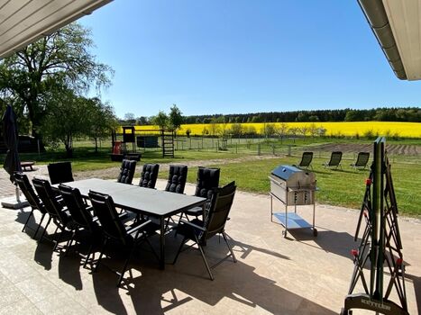 Vom Esszimmer aus gelangen Sie über eine große Terrassentür auf eine großzügig angelegte Terrasse (60 m²). Von hier aus können Sie einen traumhaften Blick auf Felder, Wiesen und Wälder genießen. Es stehen Ihnen ein Grillkamin sowie eine Sitzgarnitur mit 10 Stühlen für gesellige Stunden zur Verfügung.