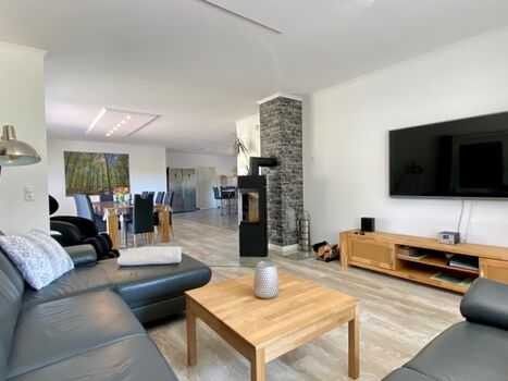 Wohnküche und Wohnzimmer sind bewusst offen gehalten und bilden zusammen mit Kaminofen eine harmonische Einheit. Neben Radio und Smart-TV stehen Ihnen ebenfalls einige Bücher sowie kostenloses Internet über WLAN zur Verfügung (aktuell noch über LTE / Funk - Breitbandausbau erfolgt in Kürze).