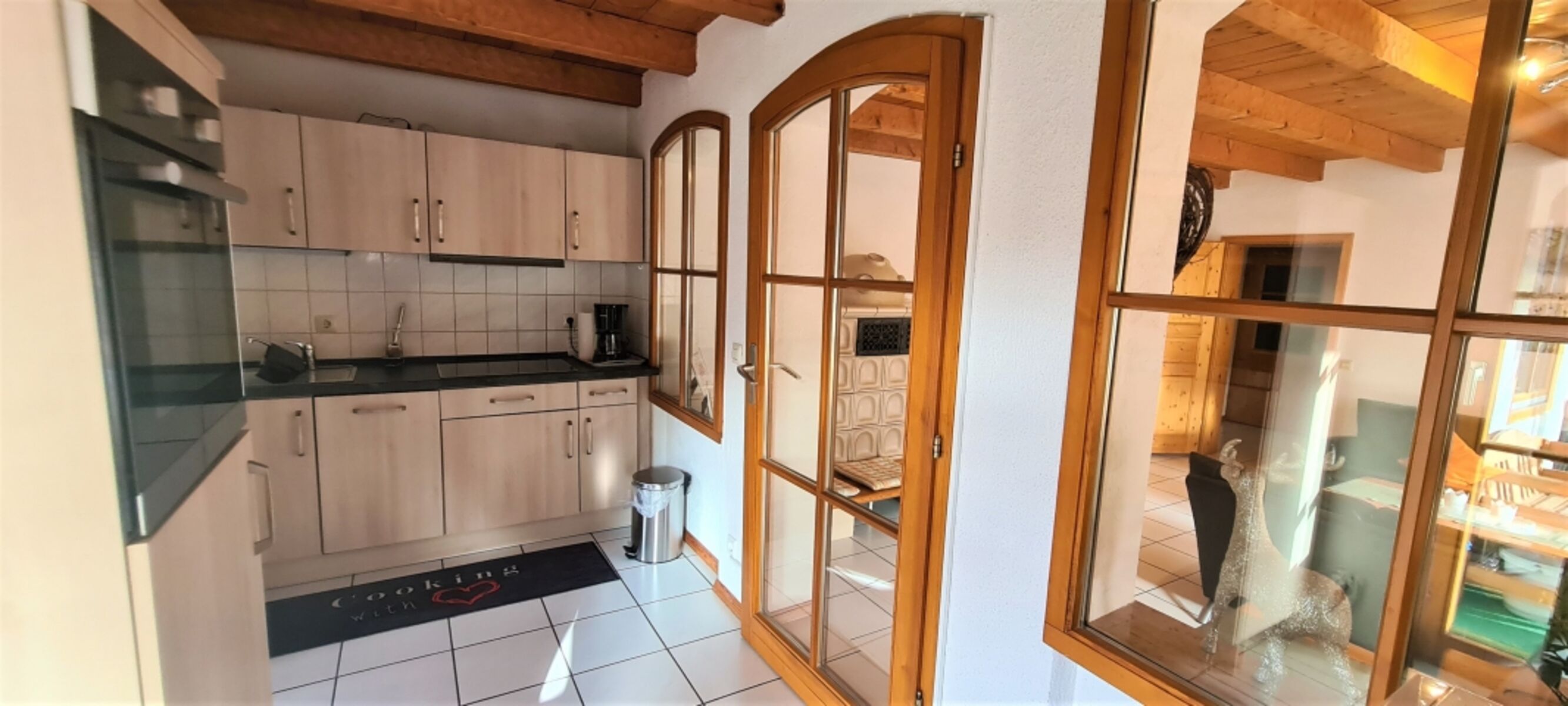 Cerankochfeld, Dunstabzugshaube, Kühlschrank mit Gefrierfach, Korkenzieher / Flaschenöffner, Öl / Essig, Geschirrhandtücher, Mülltüten