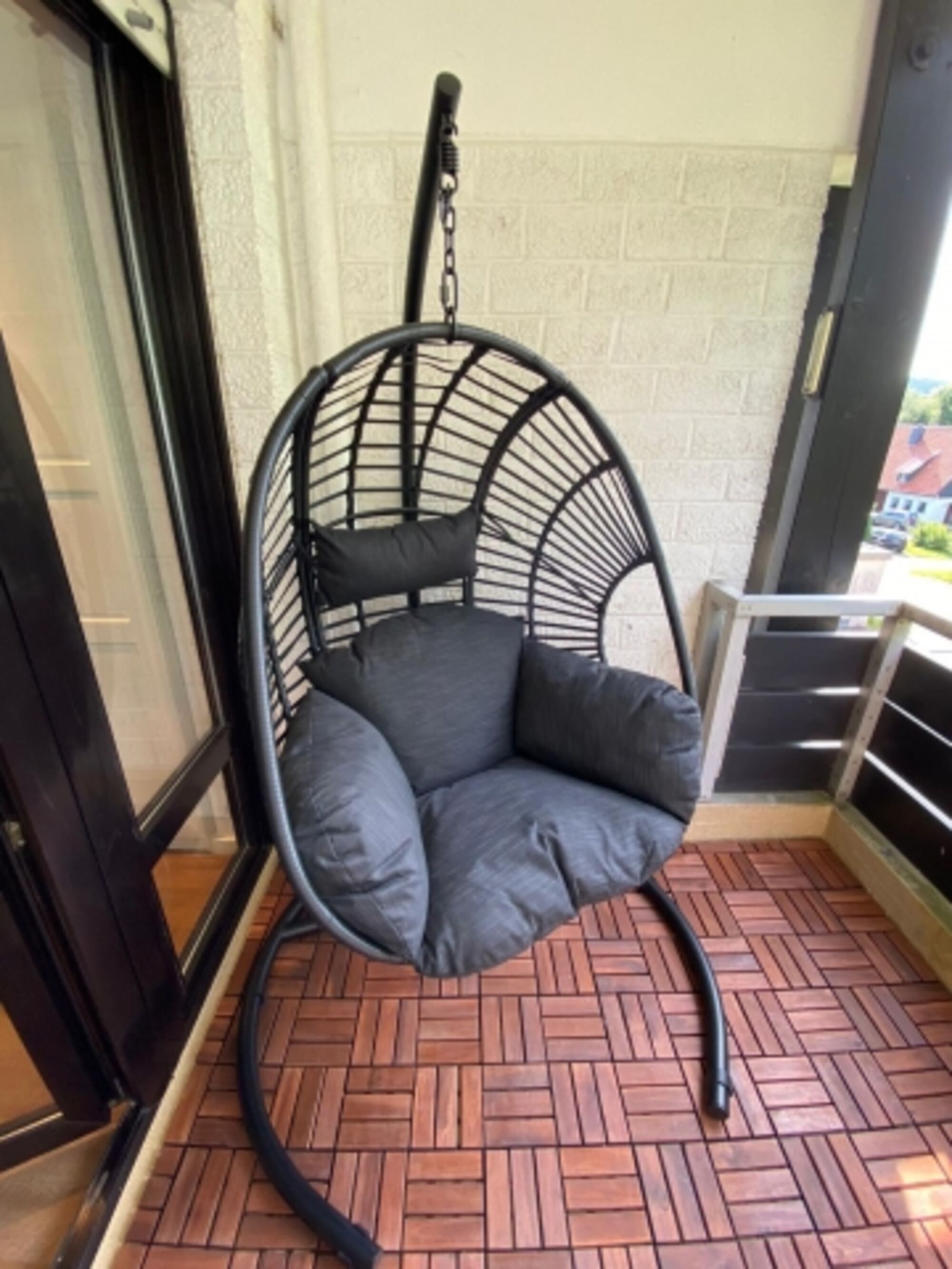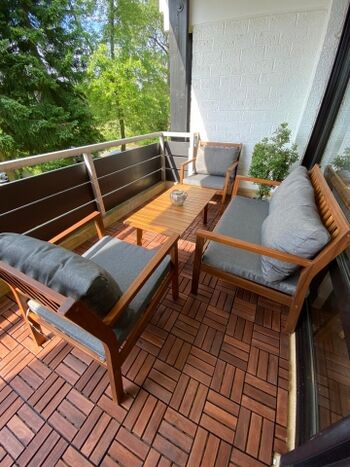 Sehr großzügiger Balkon mit Loungeecke, Hängesessel und direktem Blick auf den Bocksberg