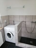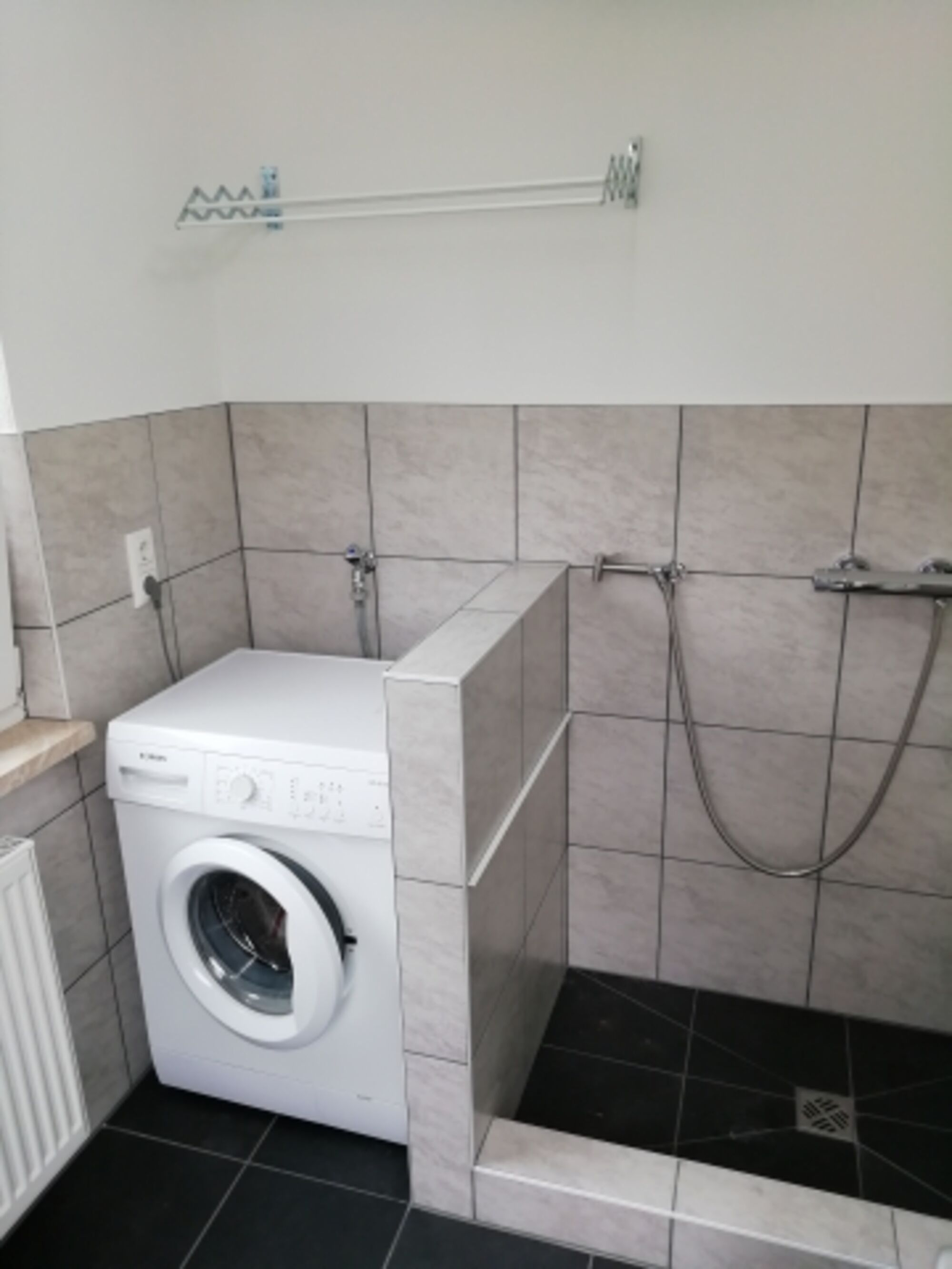 Waschmaschine mit Trockner Waschbecken, Regendusche, Kosmetiktücher, Spiegel, Fenster im Bad, Fliegengitter