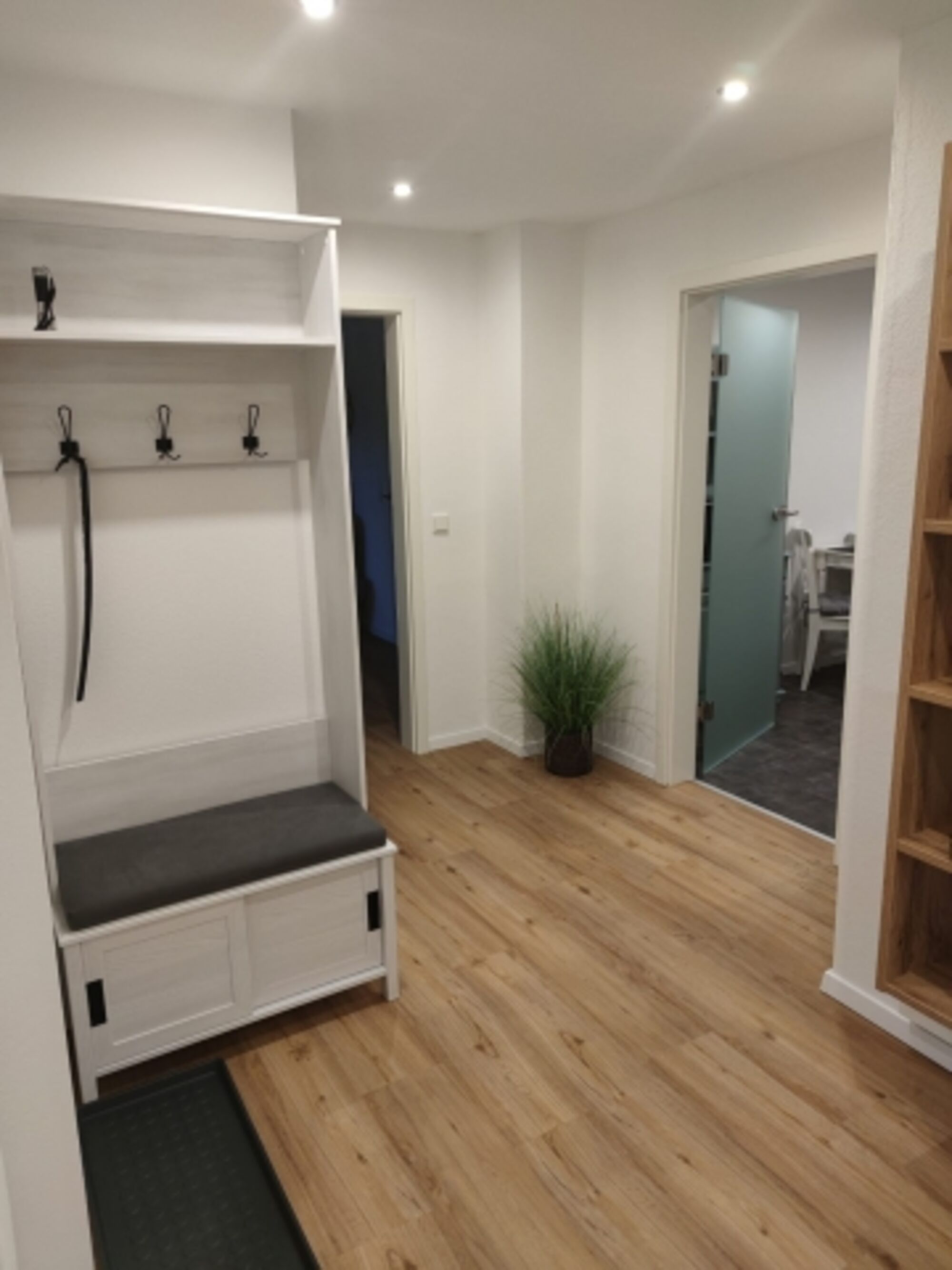 Cerankochfeld, Dunstabzugshaube, Kühlschrank mit Gefrierfach, Mixer, Korkenzieher / Flaschenöffner, Gewürze (Salz, Pfeffer, Zucker), Öl / Essig, Geschirrhandtücher, Mülltüten, Essplatz in der Küche