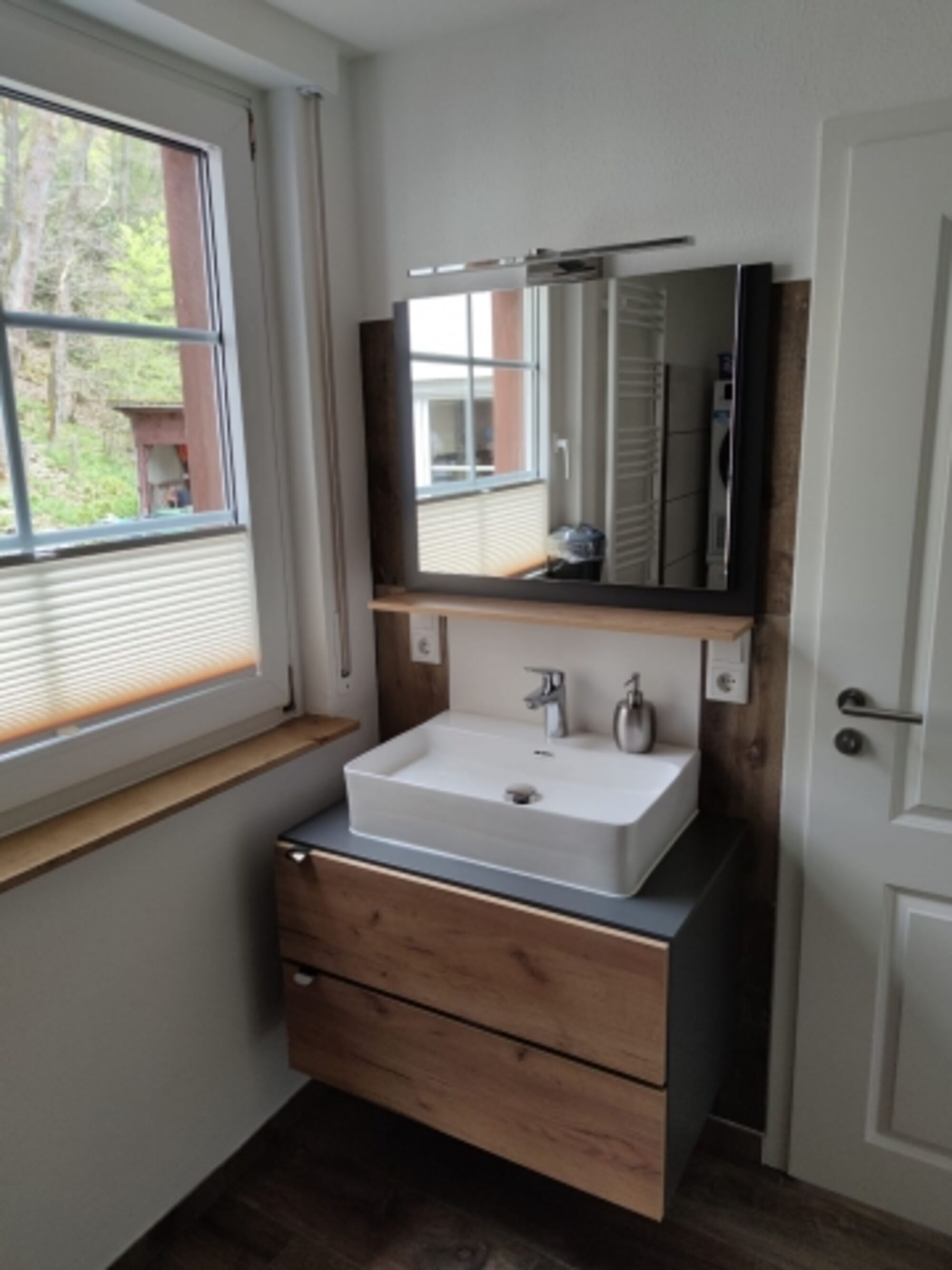 Waschbecken, Regendusche, Kosmetiktücher, Spiegel, Fenster im Bad