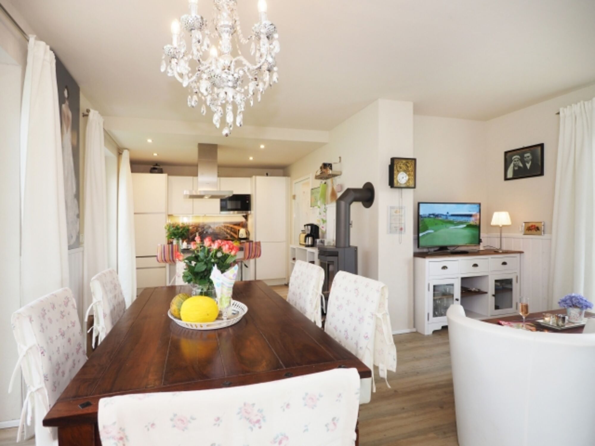 TV, Kaminofen, 3er-Sofa, Sessel, Fliegengitter