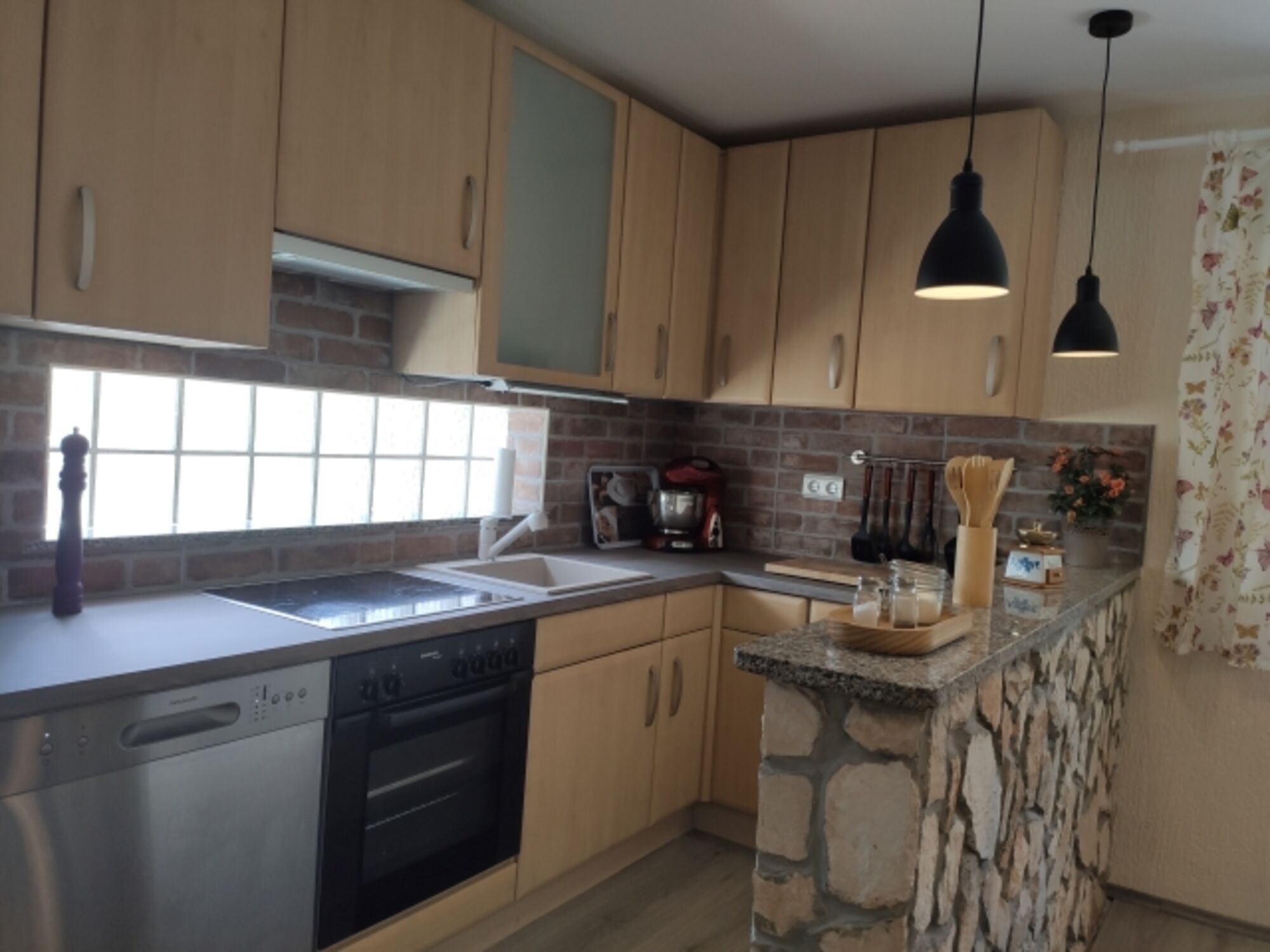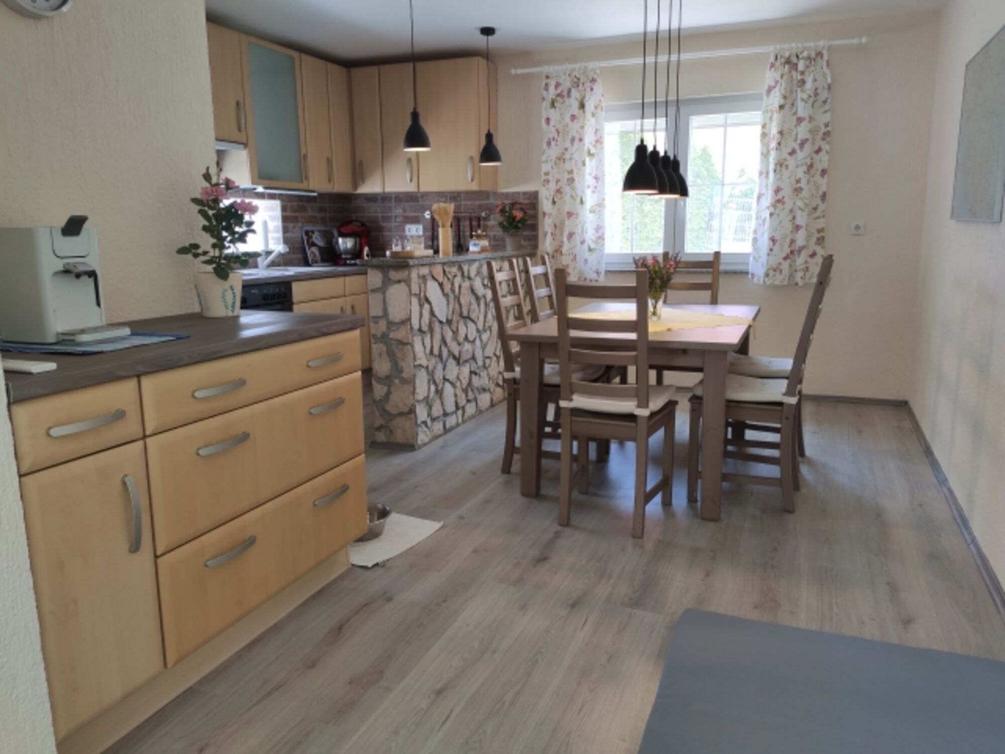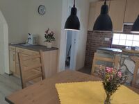 Cerankochfeld, Dunstabzugshaube, Kühlschrank mit Gefrierfach, Kaffeevollautomat, Senseo-Kaffeeautomat, Eierkocher, Küchenmaschine, Mixer, Waffeleisen, Korkenzieher / Flaschenöffner, Gewürze (Salz, Pfeffer, Zucker), Öl / Essig, Geschirrhandtücher, Mülltüten, Essplatz in der Küche