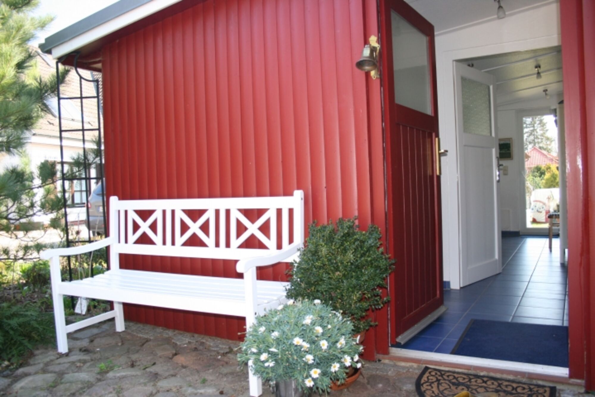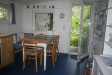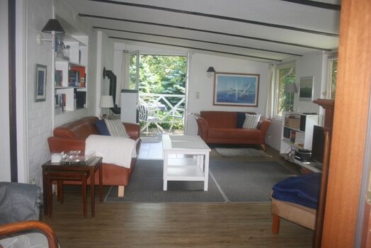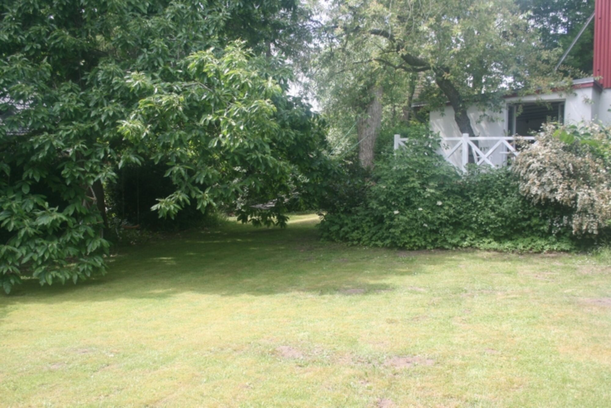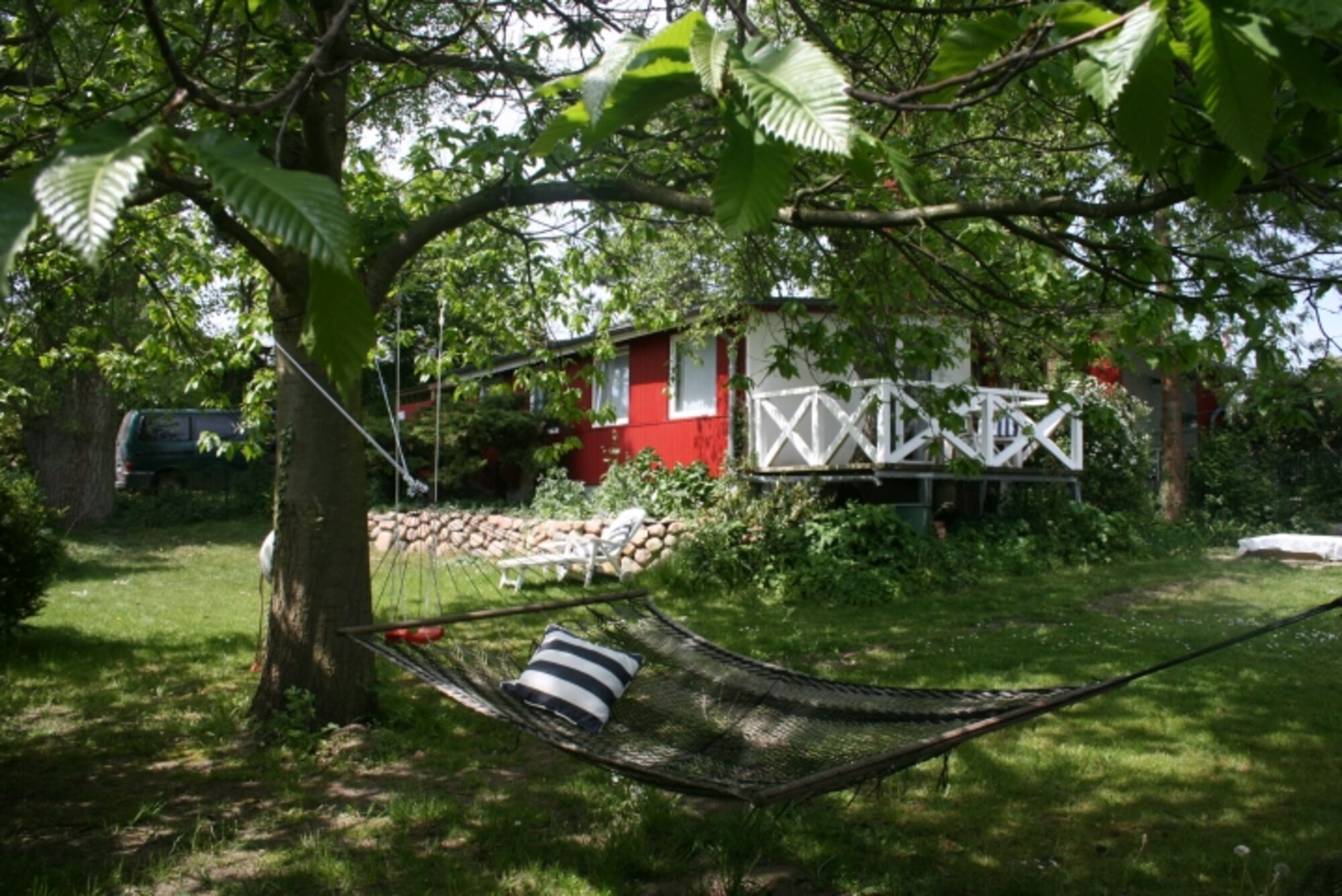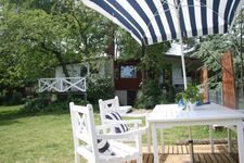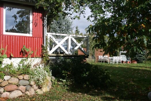 Das Holzhaus Roter Kotten ist ein Cottage im schwedischen Stil. Vier Stufen führen in den eingezäunten Garten mit altem Baumbestand. Schatten bietet die riesige Esskastanie. Die Räume sind gemütlich und hundegerecht eingerichtet. Im Garten stehen ihnen Hängematte, Strandkorb ausreichend Möbel und Sonnenschutz zur Verfügung.
