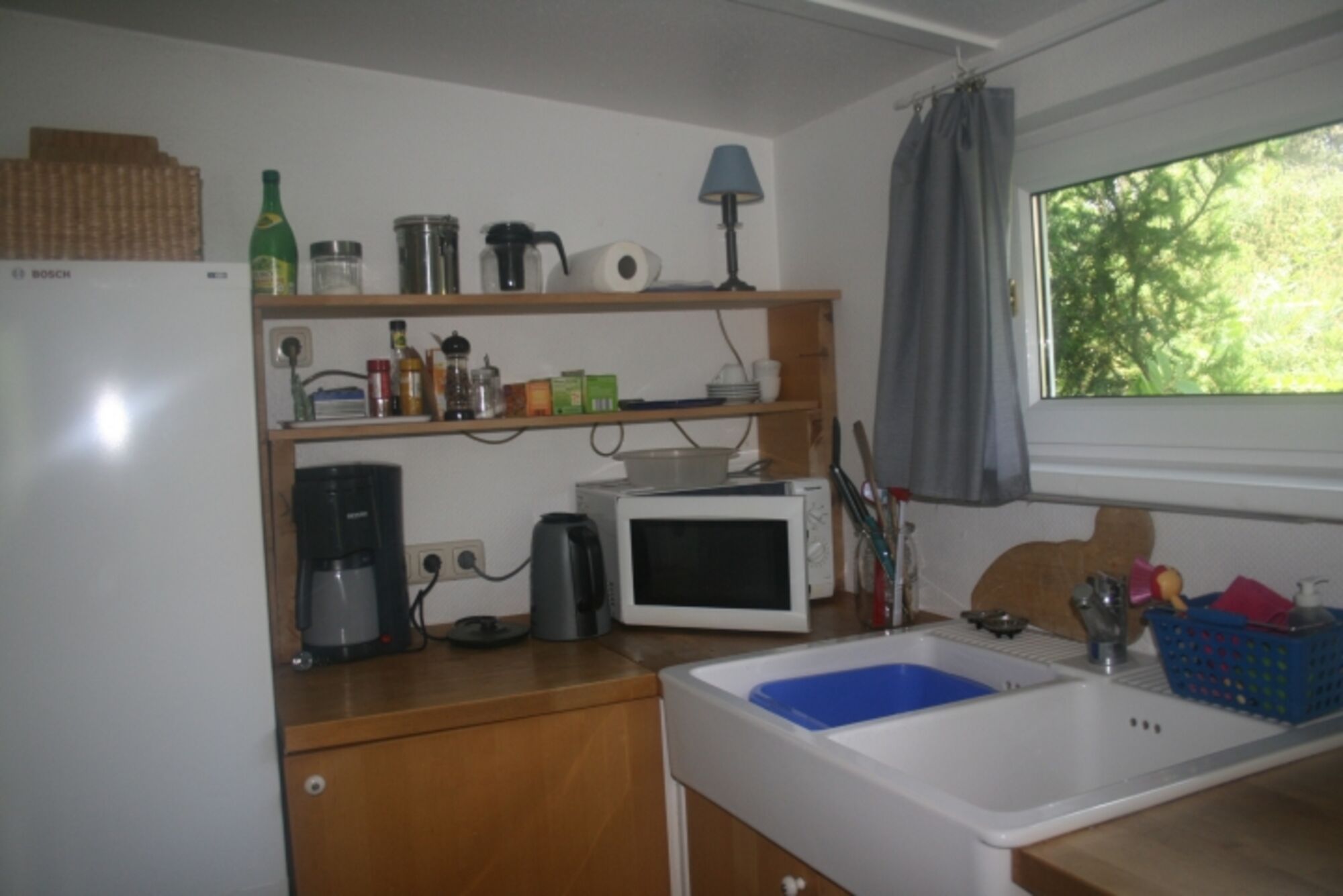 4-Platten Herd, Cerankochfeld, Kühlschrank mit Gefrierfach, Gefrierschrank, Senseo-Kaffeeautomat, Mixer, Korkenzieher / Flaschenöffner, Gewürze (Salz, Pfeffer, Zucker), Geschirrhandtücher, Mülltüten, Essplatz in der Küche