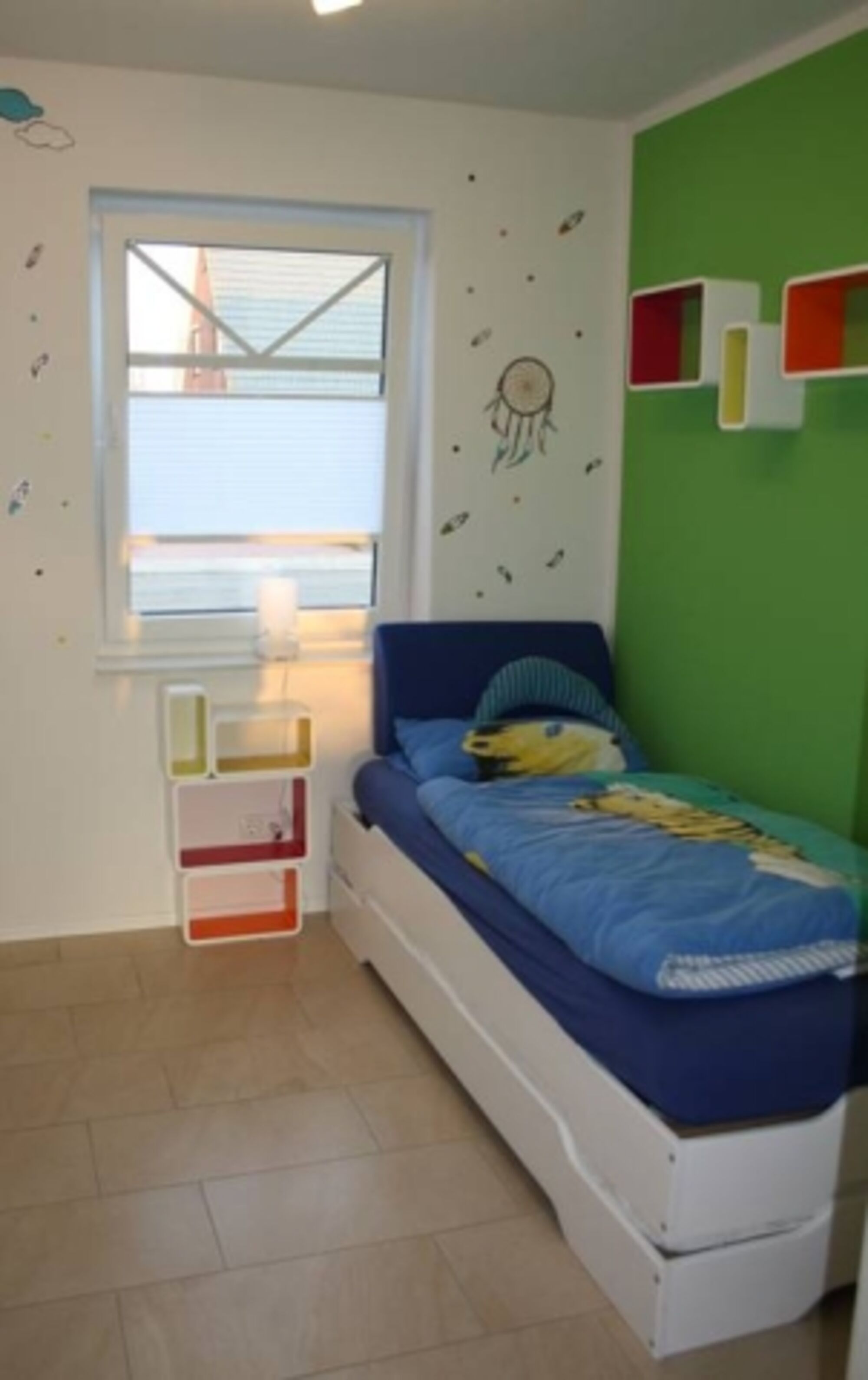 Im zweiten Schlafzimmer sind, zwei Einzelbetten - für die Kinder, für einen Erwachsenen als Stapelbett nutzbar; vorhanden. Zudem ein Kleiderschrank und Kommode.