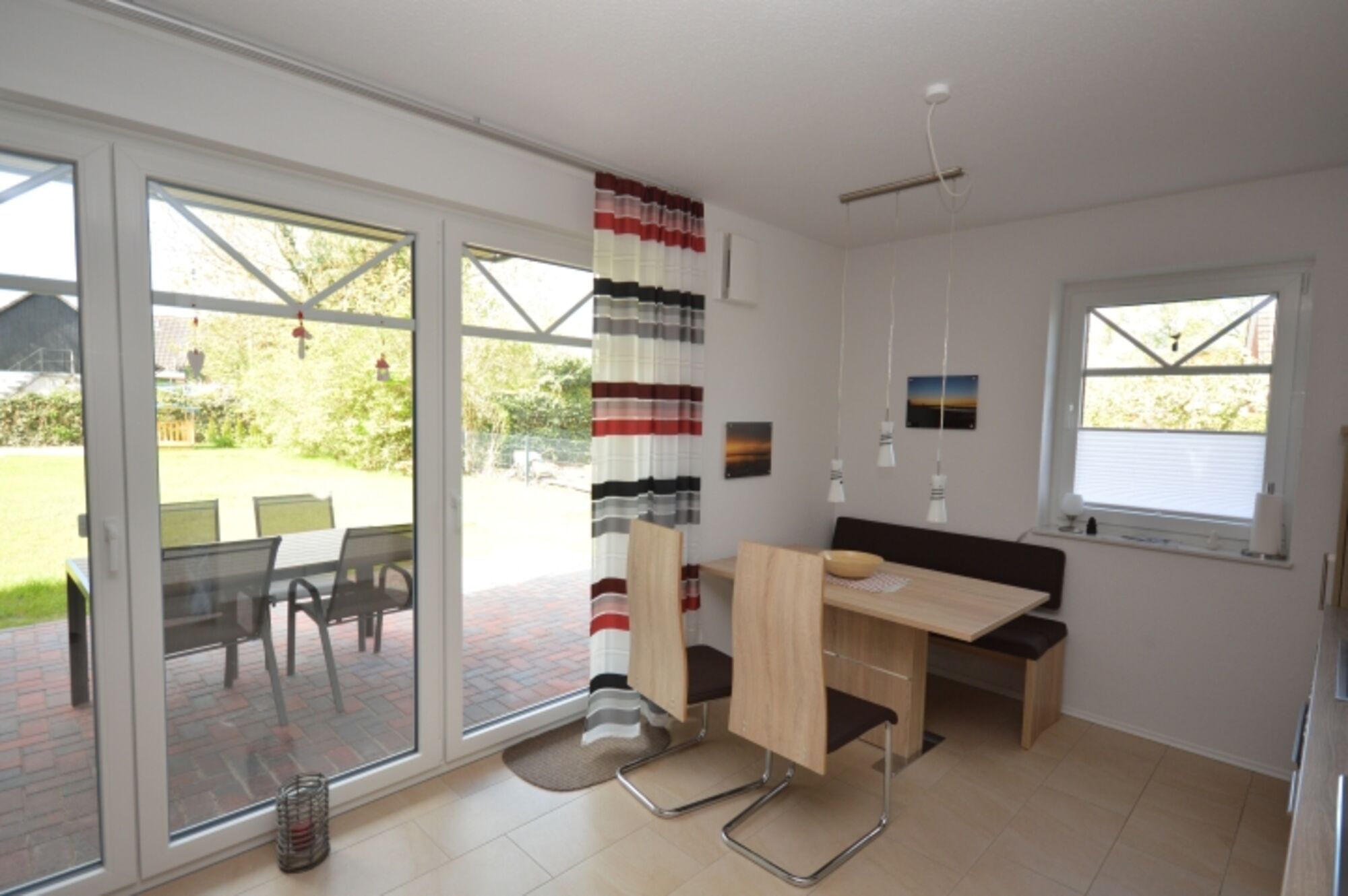 Auf die Terrasse mit Gartenmöbeln und dem anschließenden Garten gelangen Sie durch das große Fensterelement im Wohnzimmer.