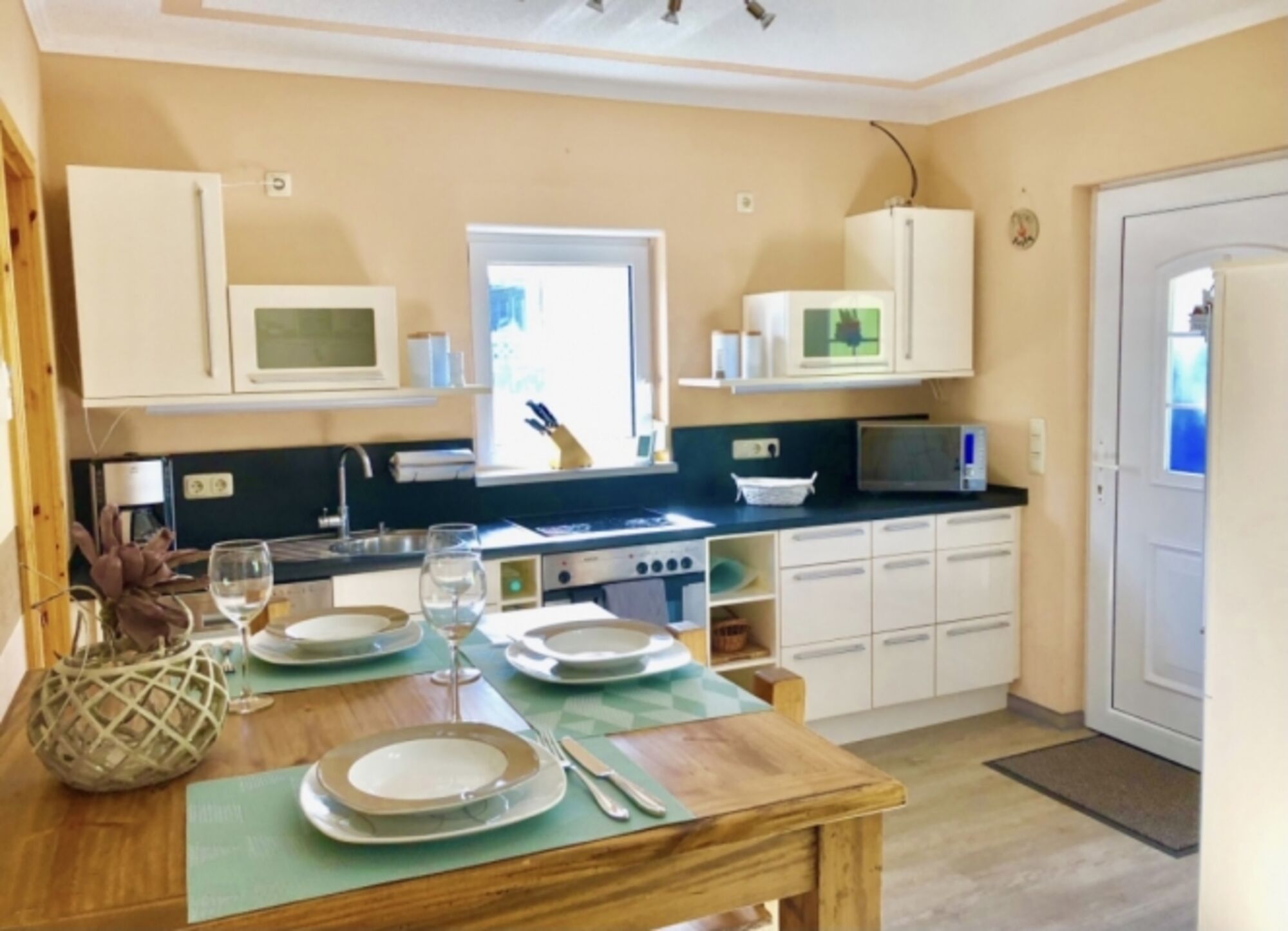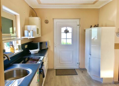 4-Platten Herd, Cerankochfeld, Kühlschrank mit Gefrierfach, Korkenzieher / Flaschenöffner, TV in der Küche
