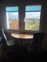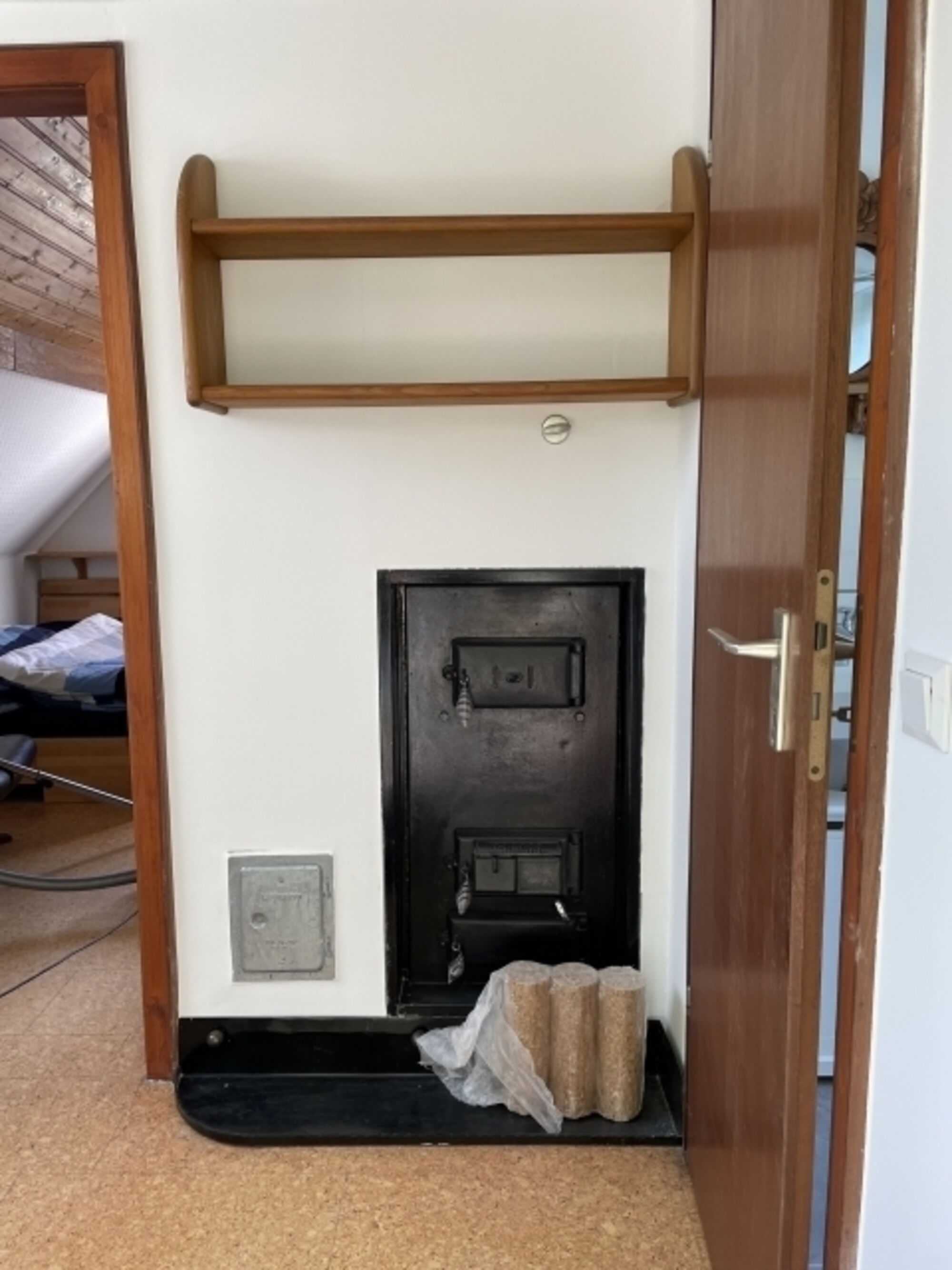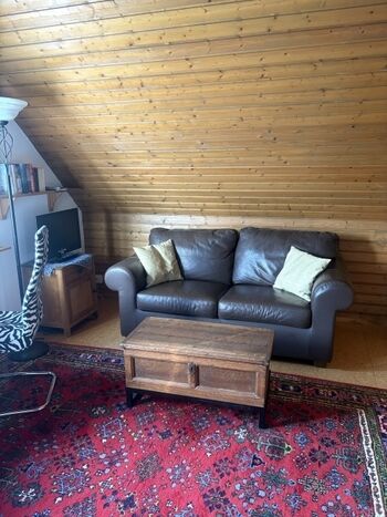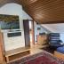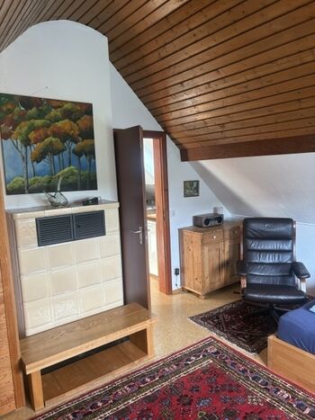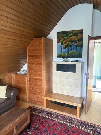 Es hat nur einen Wohnraum, mit Ledersofa (2-Sitzer), Couchtisch, kl. Esstisch mit 2 Stühlen an einem Fensterplatz mit schönem Ausblick, ein Bett (140cm breit), Sessel und Schränke. Es ist klein, hat aber alles was benötigt wird. Es verfügt sowohl über Heizkörper als auch über einen Kachelofen.