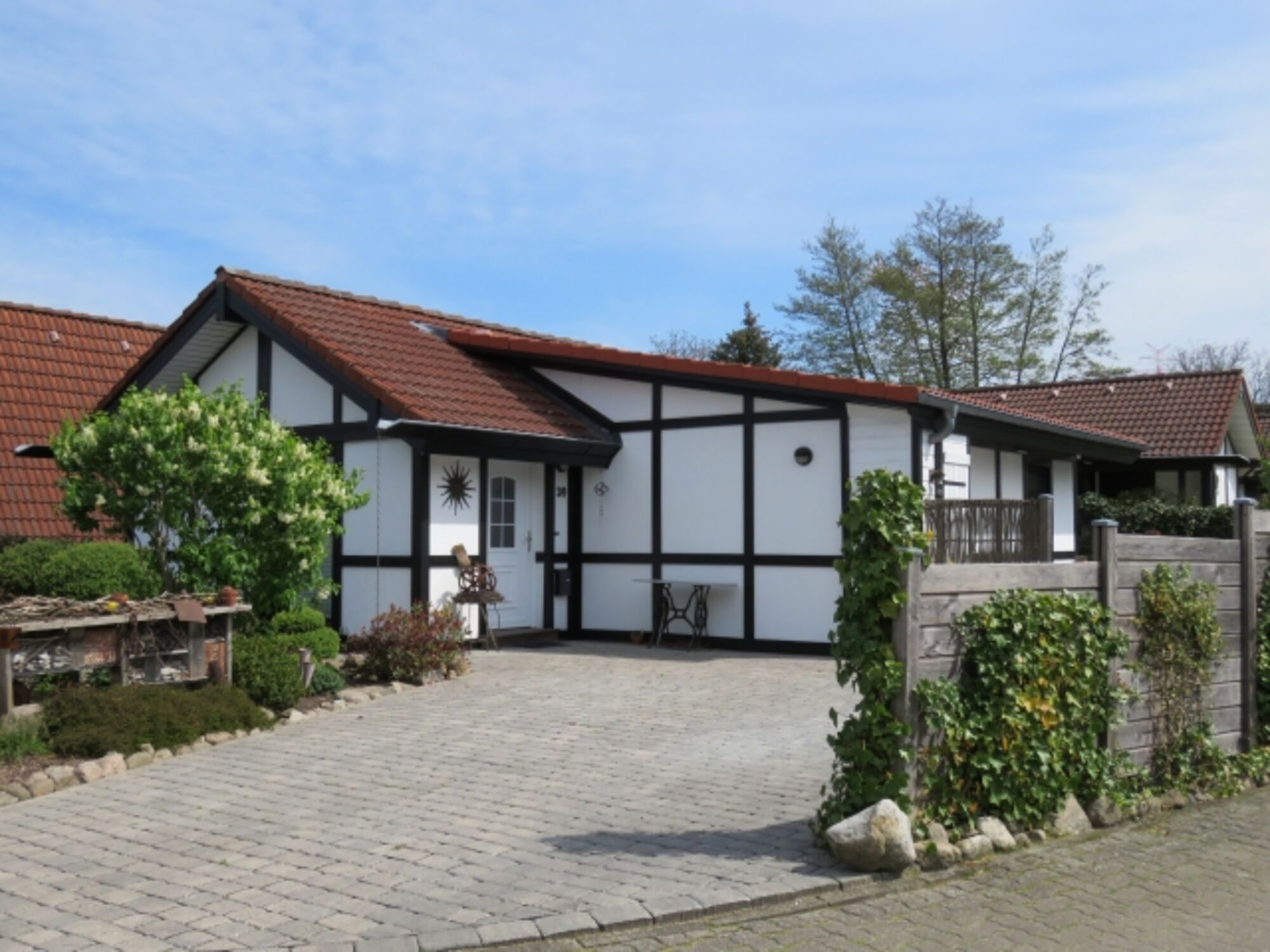 Das Ferienhaus „Deichblüte“ gibt es nur einmal im Feriendorf. Ein erstmals ab Mai 2020 zur Vermietung freigegebenes Ferienhaus, mit ca. 80 m² Wohn- und Nutzfläche, Belegung bis 6 Personen. Es verfügt über eine moderne, ansprechende, gehobene Ausstattung. Innen wurde es 2019 renoviert und 2020 teilweise neu eingerichtet. Das Haus ist mit kostenlosem WLAN ausgestattet. Wohnraum mit gemütlicher Sitzecke, Flachbildfernseher, offene Wohnküche, moderne Einbauküche (Cerankochfeld/ Backofen, Kühlschrank/Gefrierfach, Mikrowelle, Geschirrspüler), Essplatz für 6 Personen, geräumiges Duschbad/WC, Diele, Garderobe, Abstellraum innen. Gartenhaus für Fahrräder.