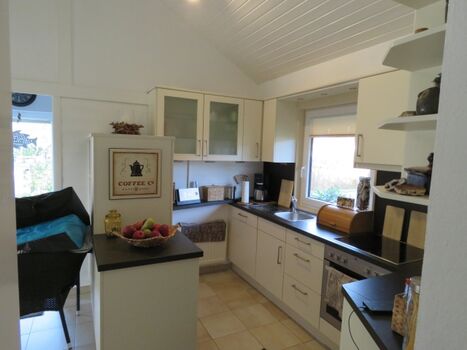 4-Platten Herd, Cerankochfeld, Dunstabzugshaube, Kühlschrank mit Gefrierfach, Korkenzieher / Flaschenöffner, Mülltüten, Essplatz in der Küche