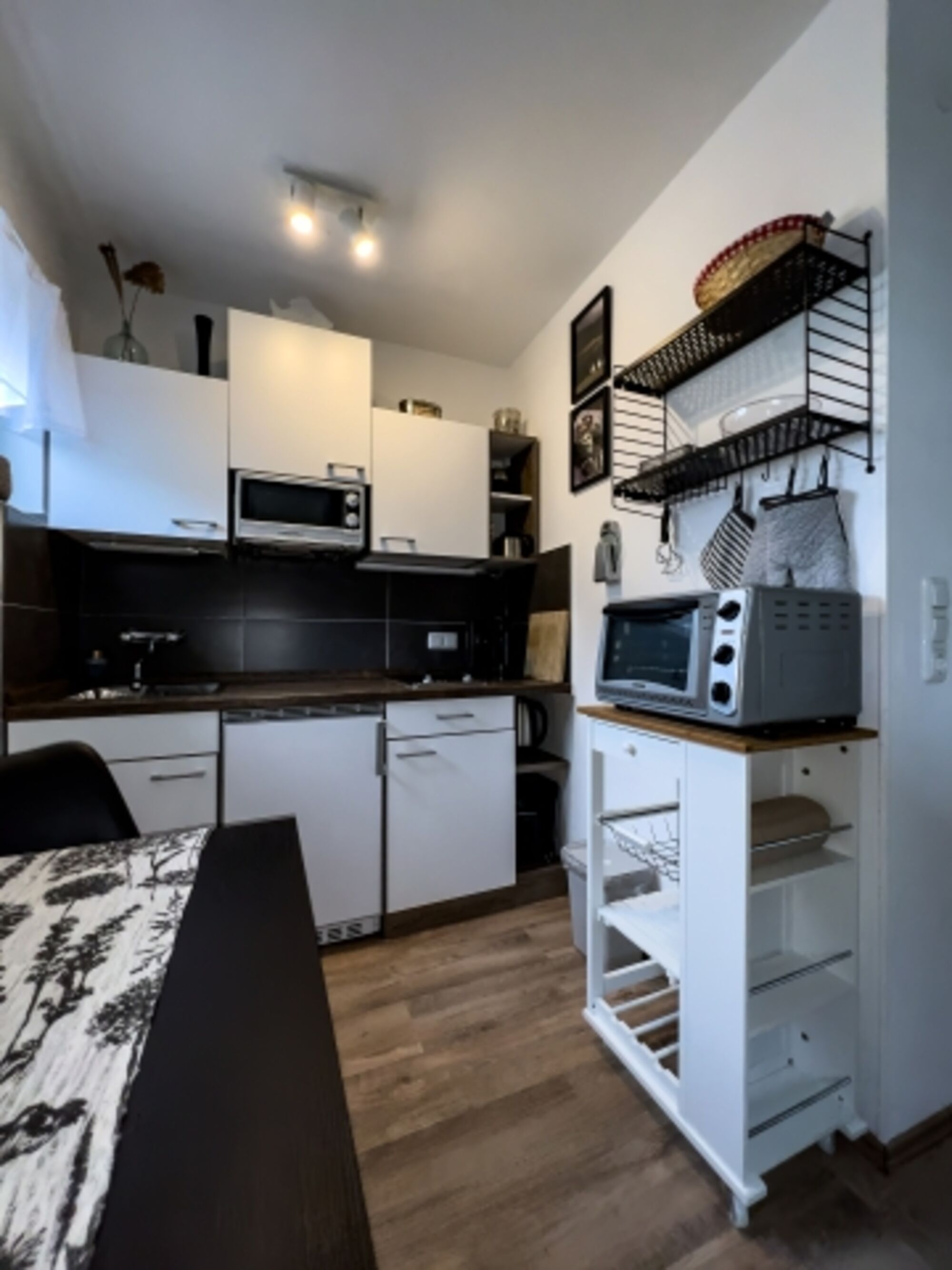 2-Platten Herd, Cerankochfeld, Kühlschrank mit Gefrierfach, Senseo-Kaffeeautomat, Eierkocher, Korkenzieher / Flaschenöffner, Gewürze (Salz, Pfeffer, Zucker), Geschirrhandtücher, Essplatz in der Küche, TV in der Küche