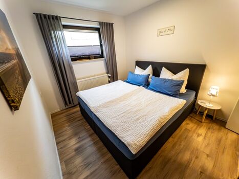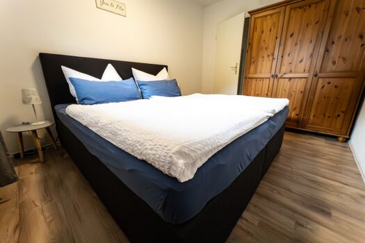 Schlafen: Erholen Sie sich im separaten Schlafzimmer im großen Boxspringbett (1,80 x 2,00 m) und verstauen Sie Ihr Gepäck bequem im geräumigen Kleiderschrank.