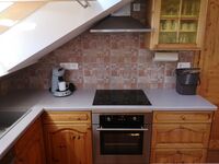 Induktionsherd, Kühlschrank mit Gefrierfach, Senseo-Kaffeeautomat, Eierkocher, Mixer, Korkenzieher / Flaschenöffner, Gewürze (Salz, Pfeffer, Zucker), Geschirrhandtücher, Mülltüten, Essplatz in der Küche, TV in der Küche