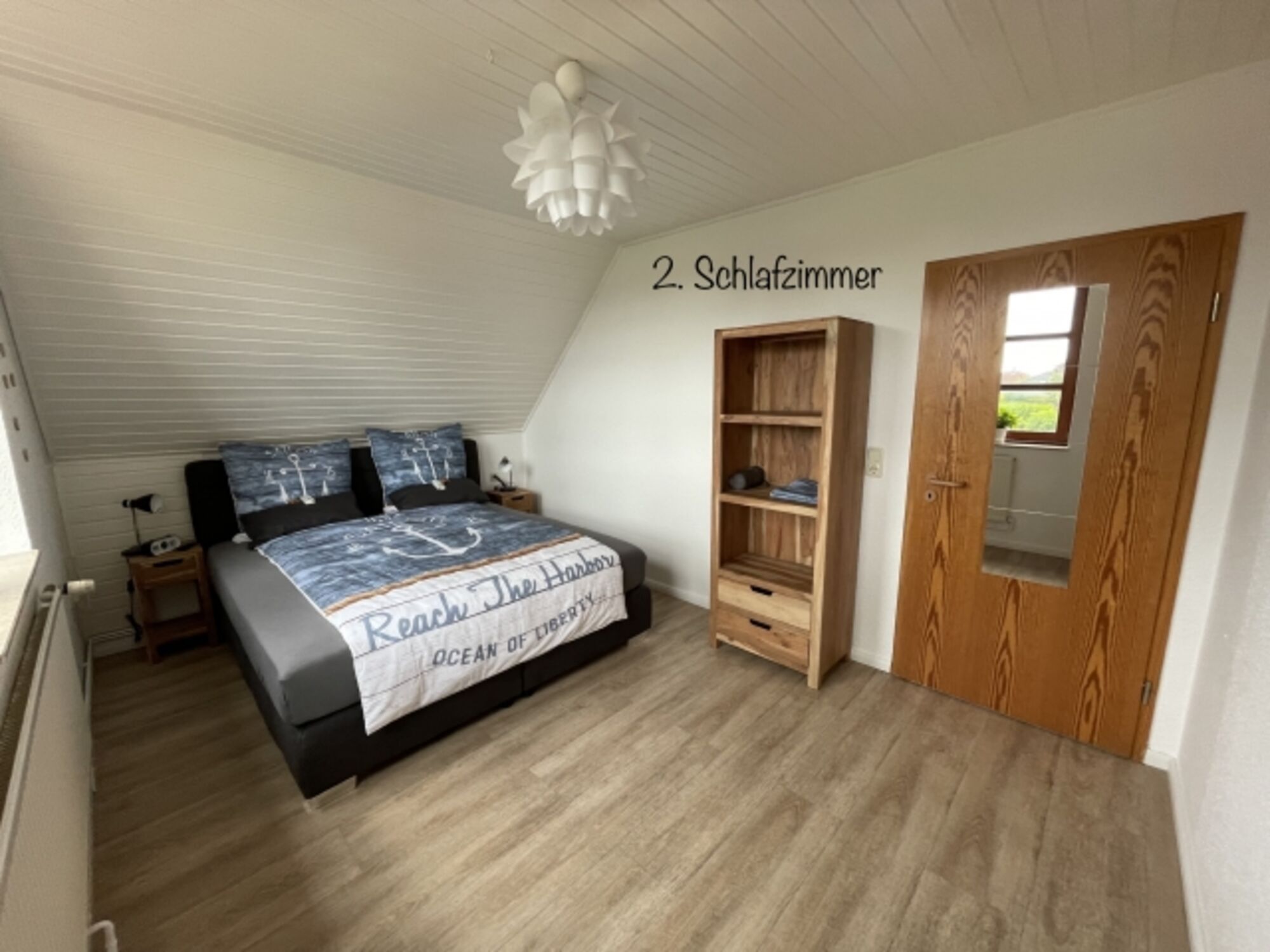 Im zweiten Schlafzimmer finden Sie Ihre Nachtruhe ebenfalls auf einem großen 1,80 m breiten Boxspringbett mit Nachtschränkchen und Regal sowie einem 40 Zoll Wand- TV . Auch von diesem Schlafzimmer aus gelangen Sie in ein Gäste- Bad mit Waschgelegenheit und Dusche .