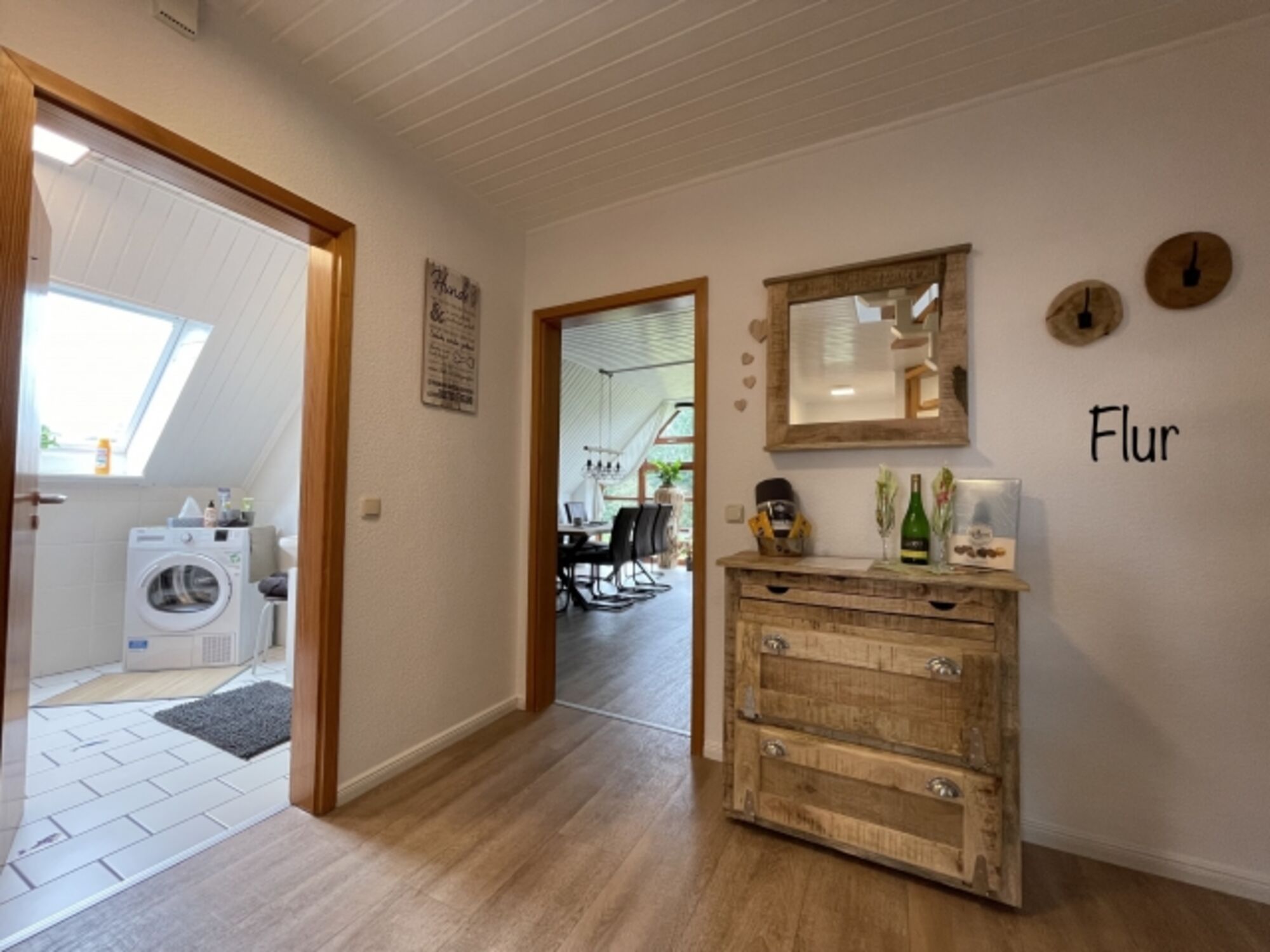 Über einen geräumigen Treppenaufgang ( auch für Hunde einfach zu begehen durch Teppichbesatz) gelangen Sie in den großen Tageslicht hellen Flur der Wohnung , von dem alle Zimmer separat abgehen .