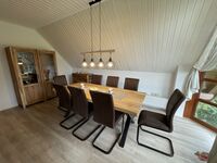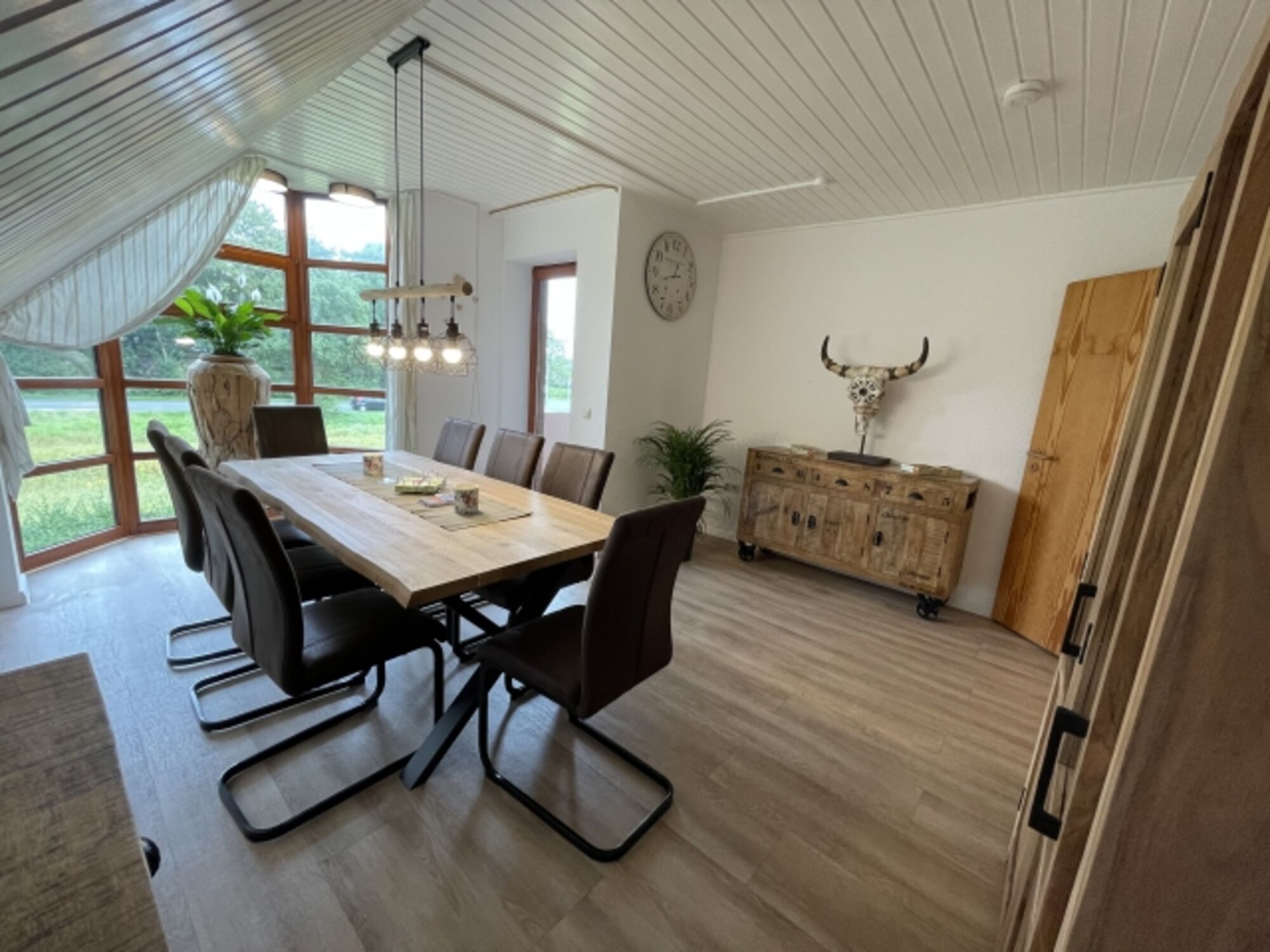 Im Esszimmer befinden sich mehrere Kommoden und ein großer Tisch mit Platz für 8 Personen.