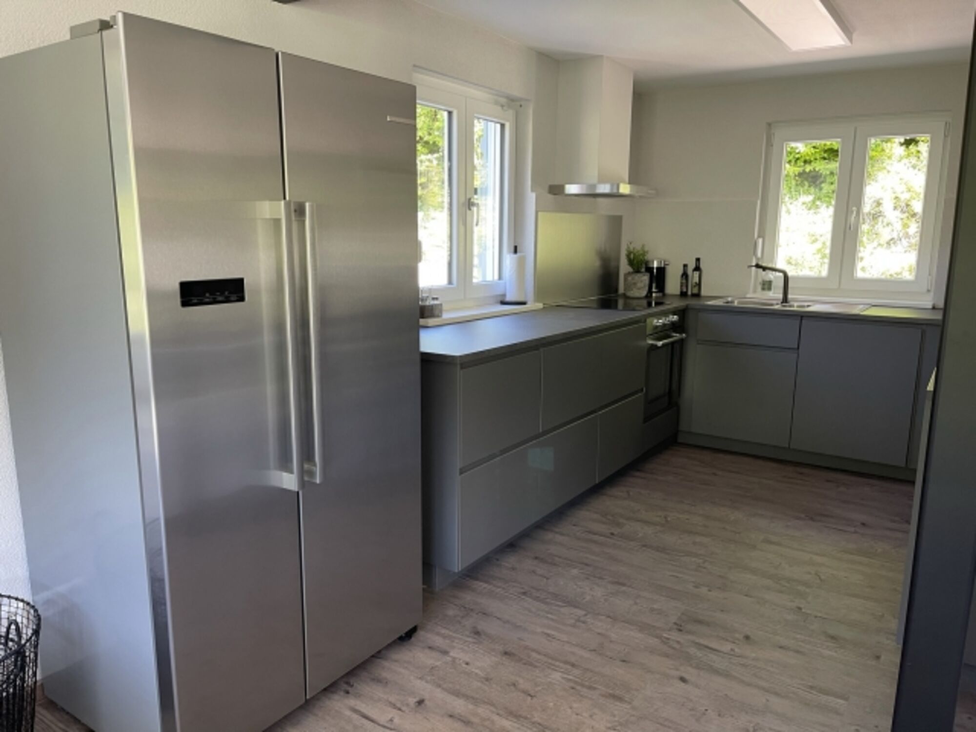 Induktionsherd, Dunstabzugshaube, Gefrierschrank, Nespresso-Automat, Korkenzieher / Flaschenöffner, Gewürze (Salz, Pfeffer, Zucker), Öl / Essig, Geschirrhandtücher, Mülltüten
