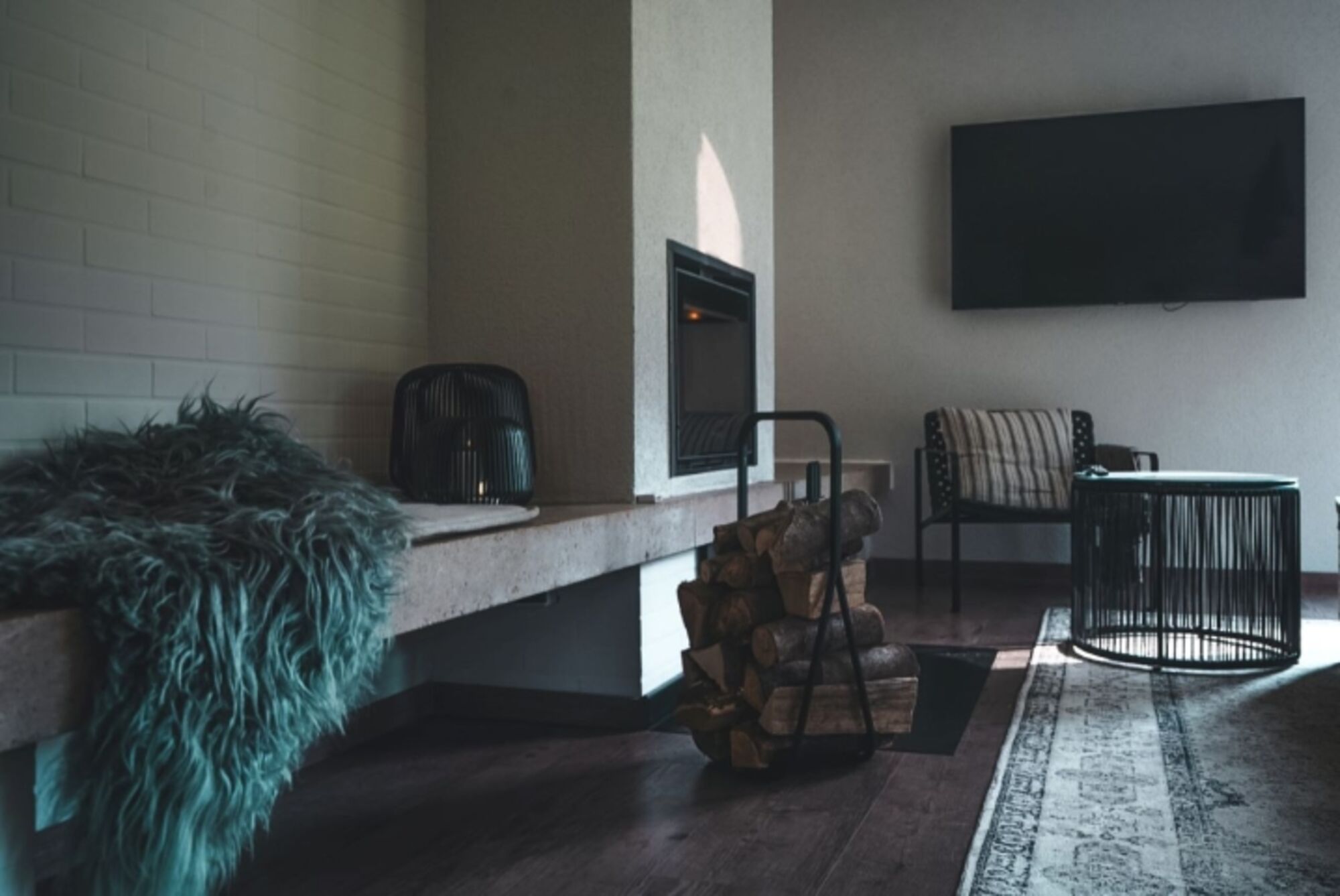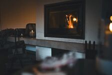 TV-Sat, TV-Flachbildschirm, Bücher, Offener Kamin, 2er-Sofa, Sessel