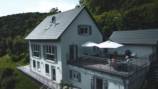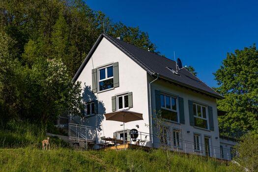 Das gesamte Hanggrundstück umfasst ca. 1.500 m² und ist rundum 1,60 m hoch eingezäunt. Das Haus öffnet sich nach Süden mit bodentiefen Fenstern und mehreren Holzterrassen – Ihr Wohnzimmer im Grünen. Drinnen erwarten Sie klare Linien, moderne Ausstattung und ein Kaminofen als gemütlicher Mittelpunkt. Selbst vom Esstisch aus lassen sich Rehe beobachten. Ein Ort für entspannte Auszeiten mit Hund: viel Natur, viel Freiheit, viel Ruhe.
