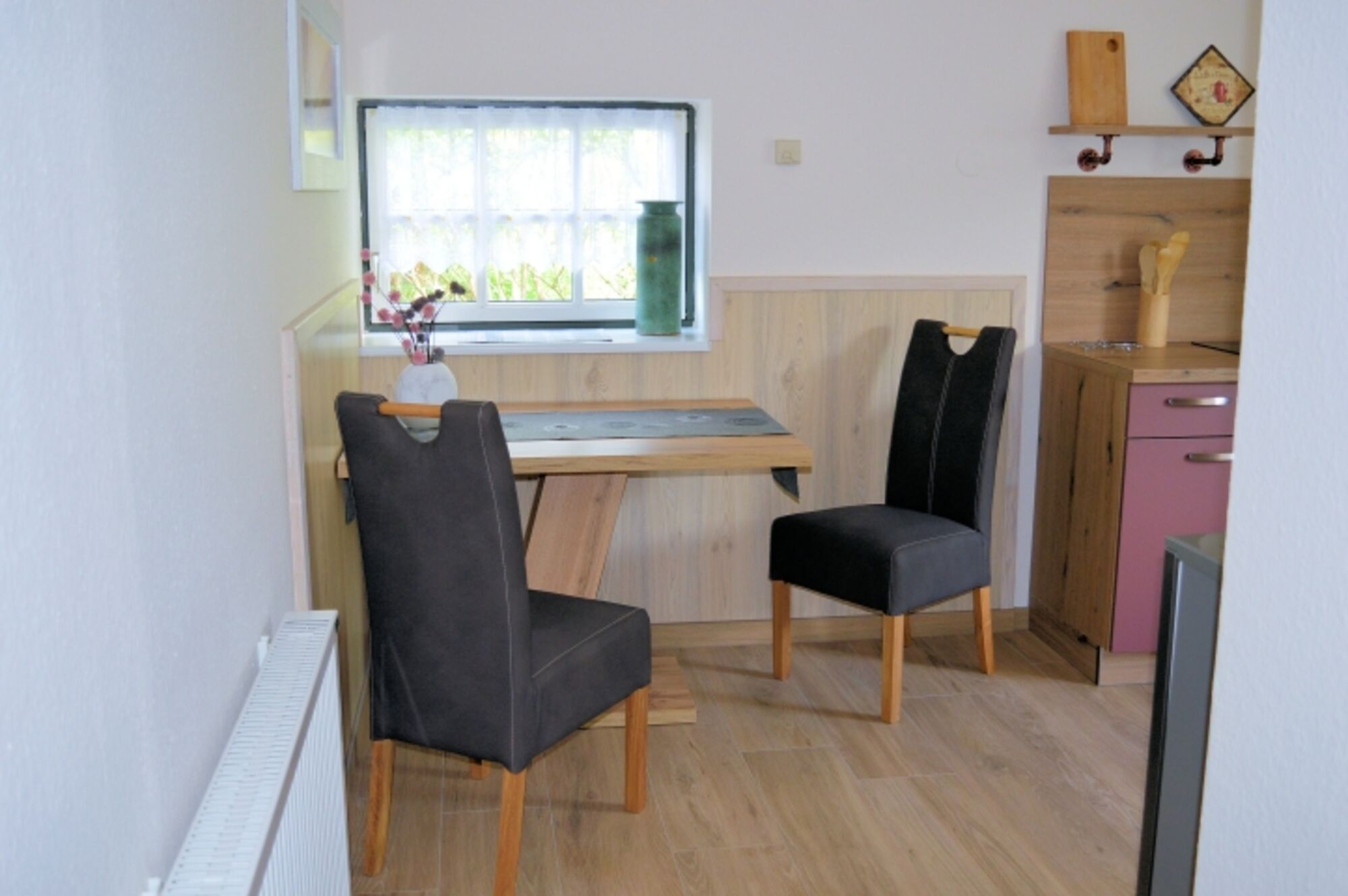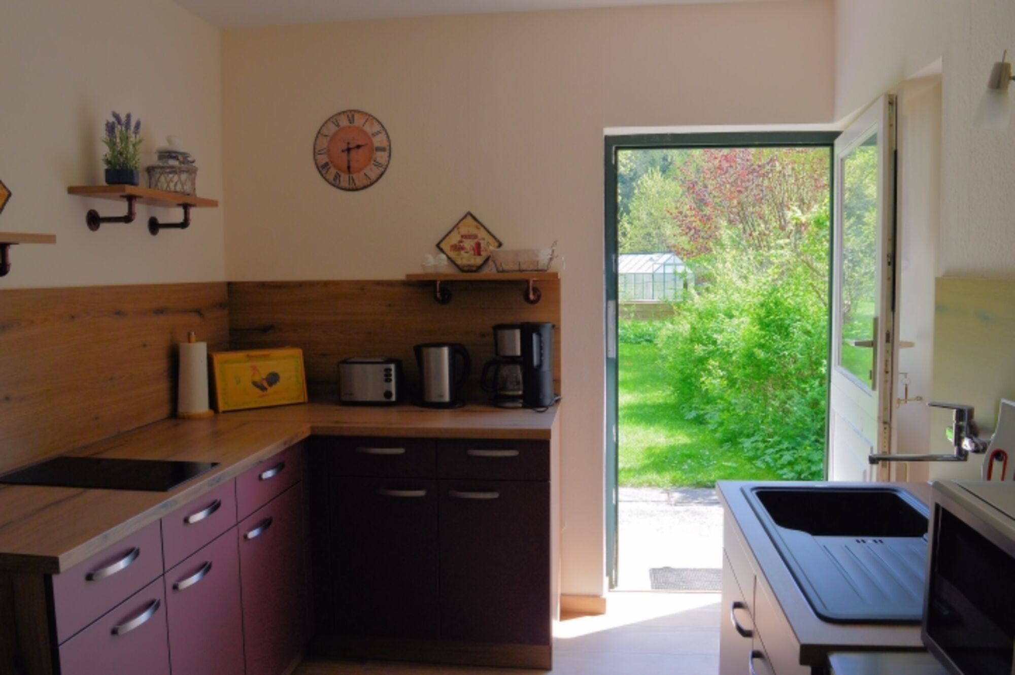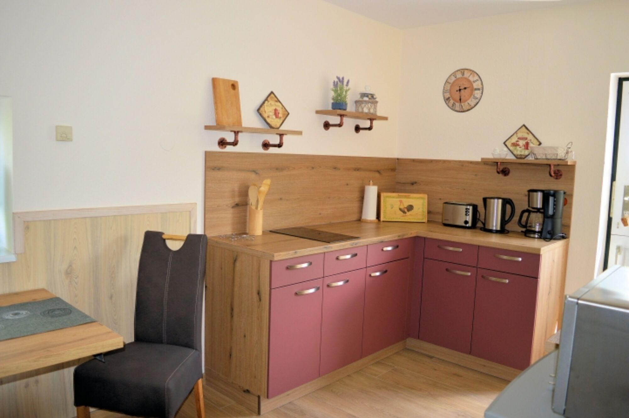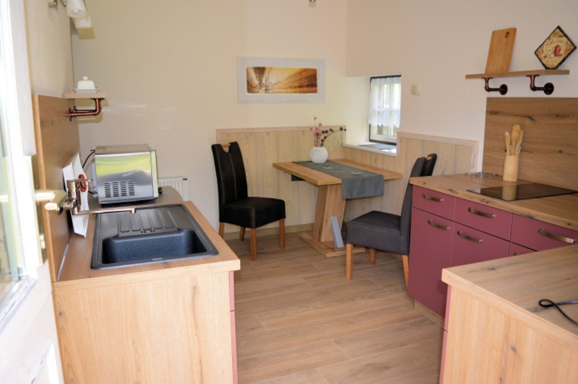 2-Platten Herd, Induktionsherd, Kühlschrank mit Gefrierfach, Eierkocher, Korkenzieher / Flaschenöffner, Gewürze (Salz, Pfeffer, Zucker), Geschirrhandtücher, Mülltüten, Essplatz in der Küche
