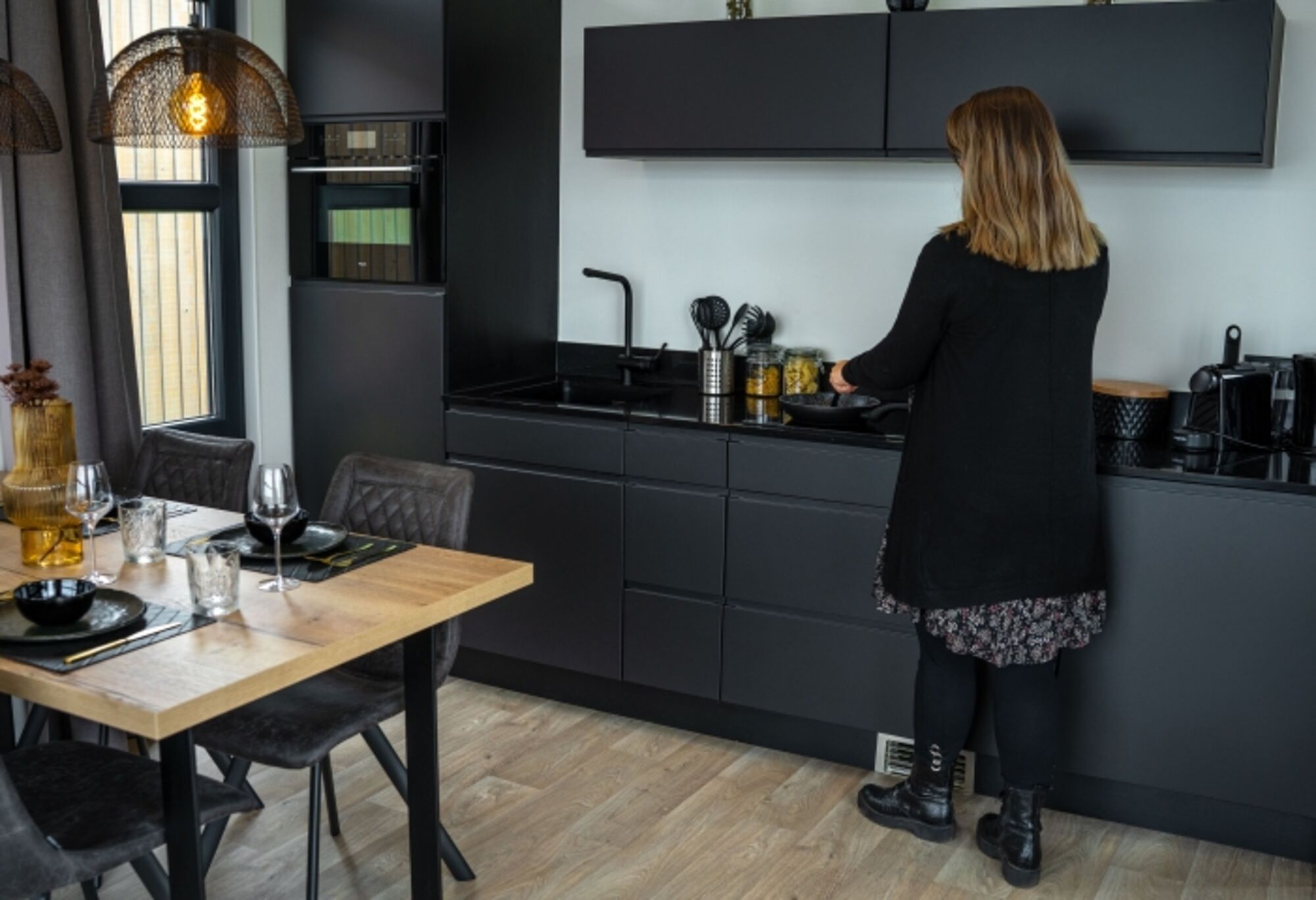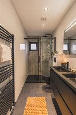 Die Villen wirken durch die hohen Decken und großen Glasfenster sehr groß. Dies garantiert viel Licht. In der Villa selbst finden Sie ein modernes, großes Wohnzimmer, ausgestattet mit einem stilvollen Sofa, bequemen Sesseln, einem Essbereich für 4 Personen und einem großen Flachbildfernseher. Ein perfekter Ort, um gemeinsam ein leckeres Essen zu genießen, ein Brettspiel zu spielen oder einfach einen Film zu sehen. In der modernen Küche finden Sie alles, was Sie brauchen, um Ihre Kochkünste unter Beweis zu stellen, darunter eine Kühl-Gefrierkombination, ein Kochfeld mit eingebautem Dunstabzug, eine Kombi-Mikrowelle, eine Spülmaschine, eine Kaffeemaschine, einen Wasserkocher und eine Nespresso-Kaffeemaschine.