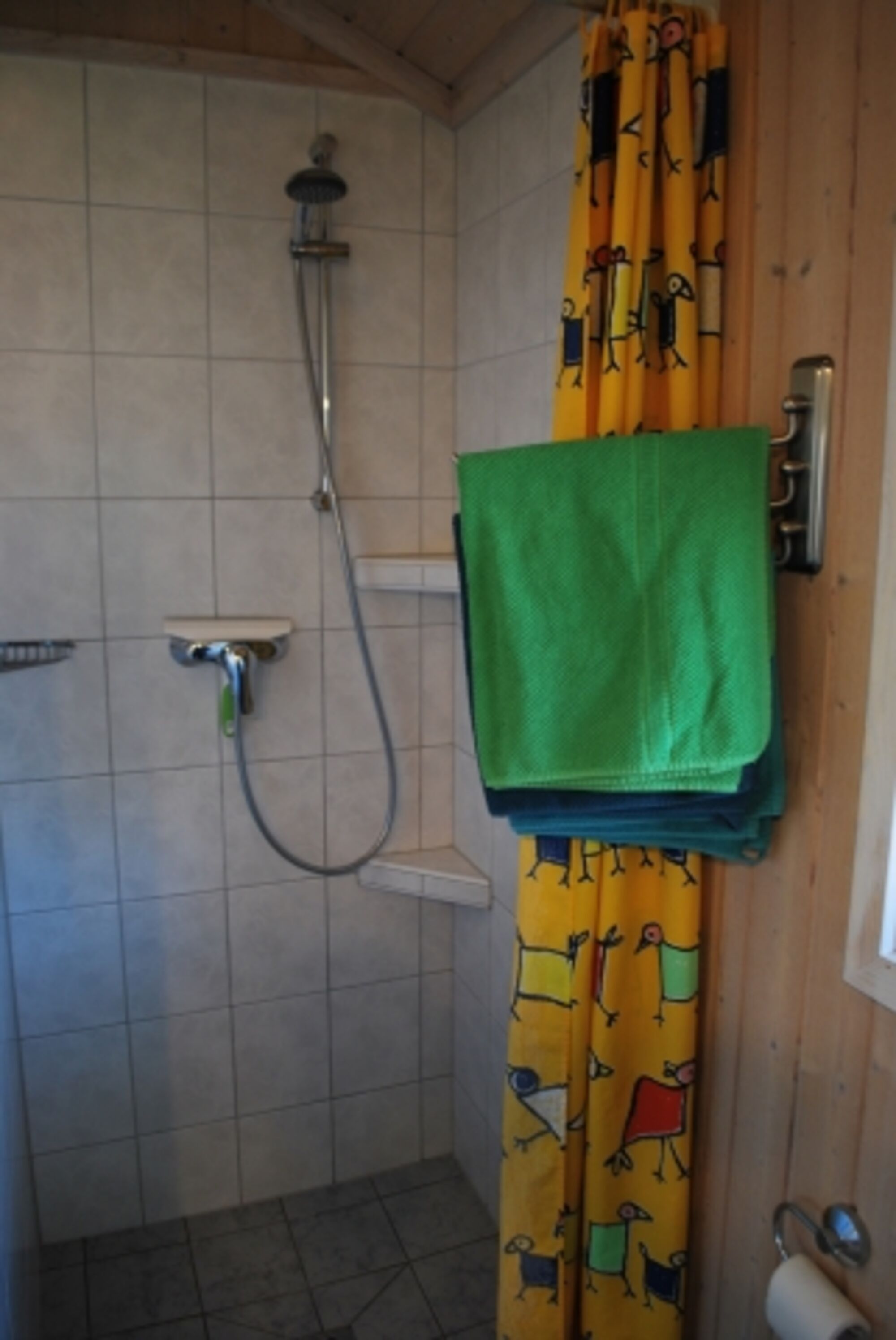 Das Elternschlafzimmer hat ein Doppelbett, im Kinderzimmer finden Sie zwei Einzelbetten. Im Badezimmer mit Fenster, Dusche und WC finden Sie eine Fußbodenheizung. Das extra WC ist mit einem Fenster ausgestattet. Zusätzlich gibt es im Wohnbereich eine „Koje“ als kleinen Rückzugsort. Im kleinen Abstellraum am Haus finden z.B. Getränke Platz.