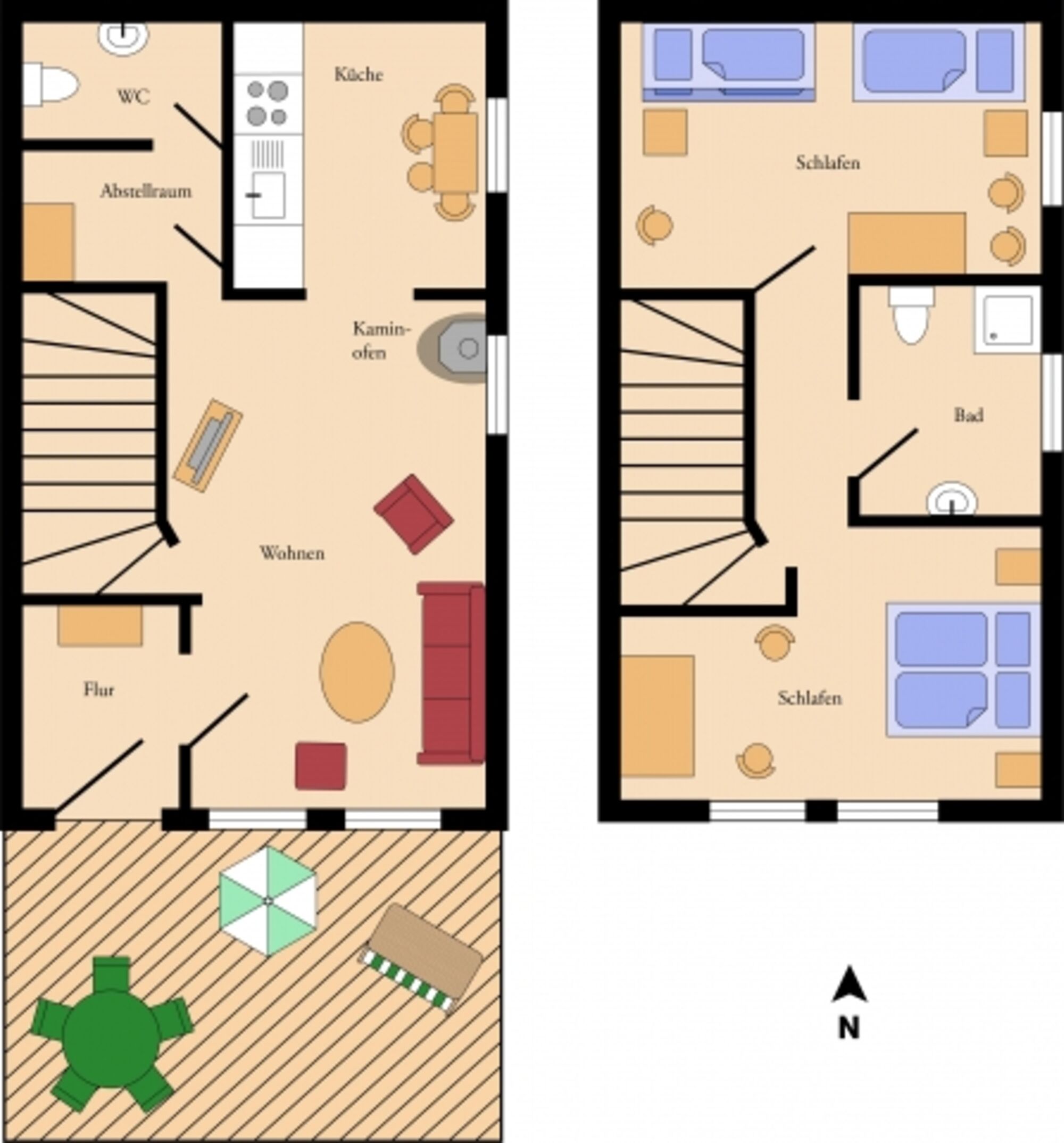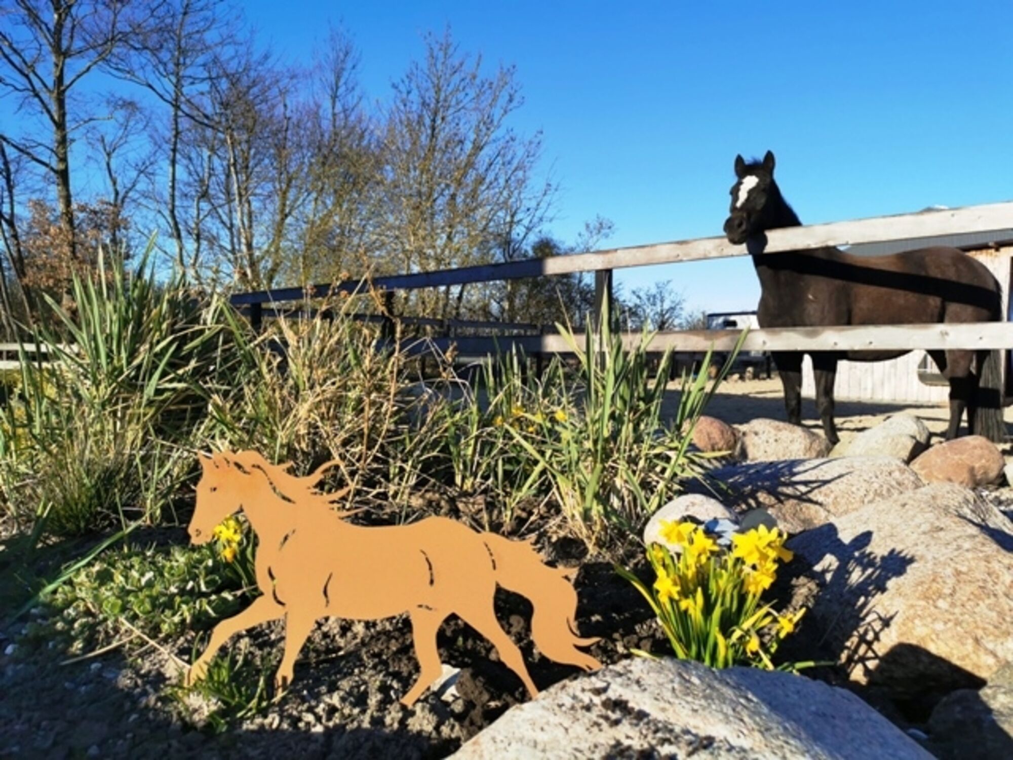Ihre Ferienwohnung Tenne liegt in der ehemaligen Scheune, geht über zwei Etagen und bietet Platz für bis zu fünf Personen. Mit Blick zum Deich und dem Pferdestall kann man sich hier so richtig gut erholen. Ein Wohnraum mit Kamin, TV und Essbereich, eine offene, voll ausgestattete Küche und ein extra WC befinden sich im Erdgeschoss. Die beiden Schlafzimmer und das Badezimmer finden Sie im Obergeschoss. Das Elternschlafzimmer hat ein Doppelbett, das Kinderzimmer ist mit einem Etagenbett und einem Einzelbetten ausgestattet. Im Badezimmer mit Fenster, Dusche und WC finden Sie auch eine Handtuchhheizung.