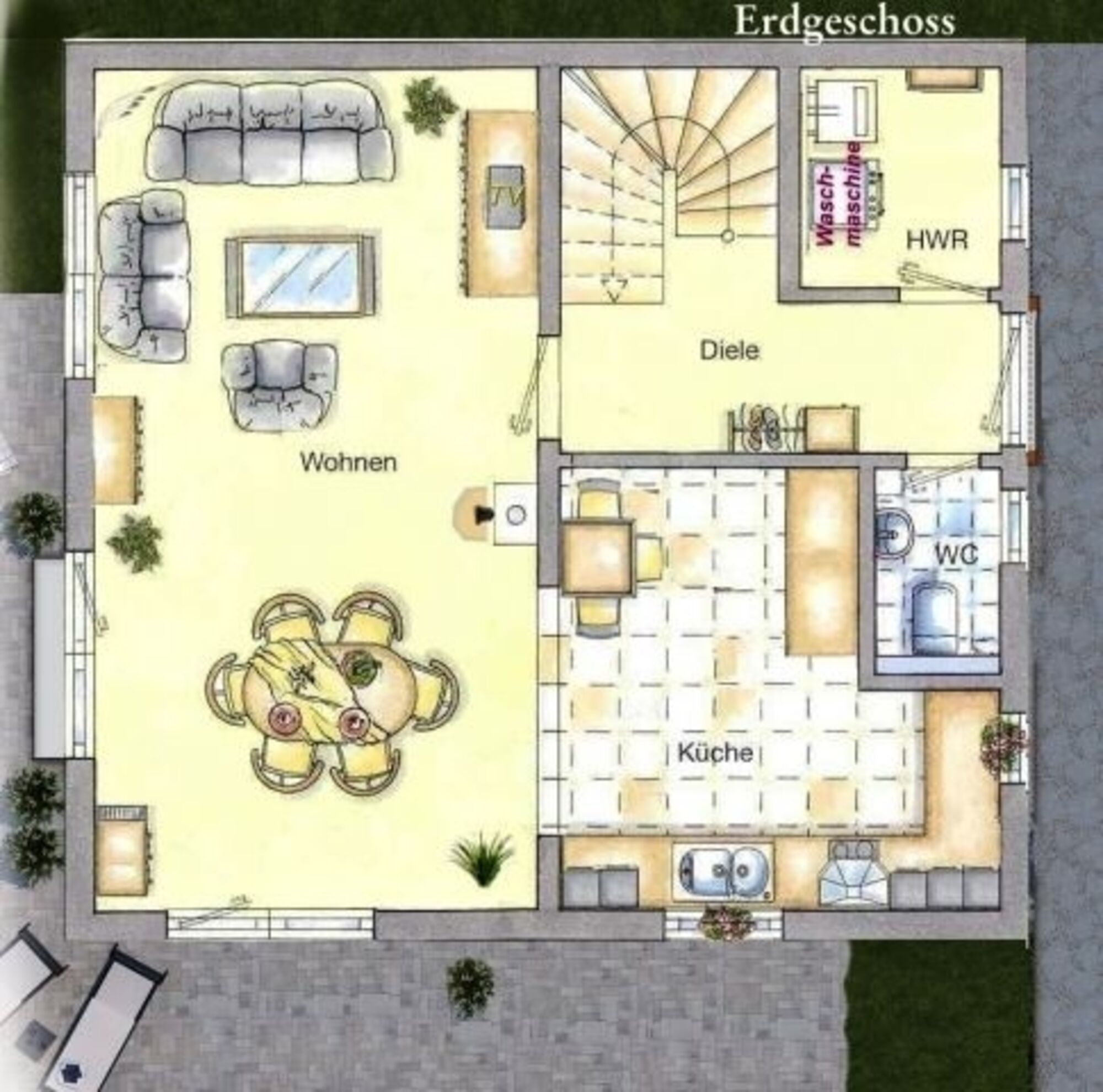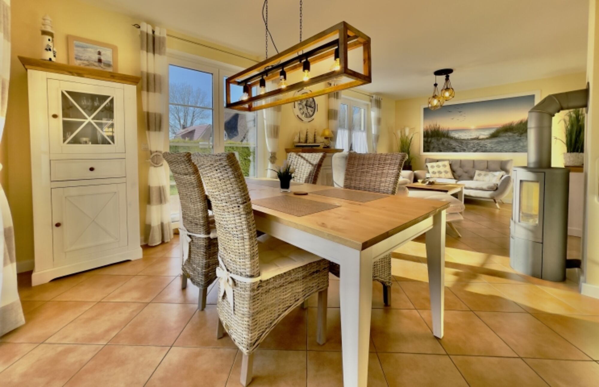 Das Erdgeschoss bietet einen gemütlichen Wohn- und Essraum mit offener großer Küche und 2 angrenzenden Terrassen, in Süd- und West-Richtung. Ein Kamin rundet geschmackvoll die Ambiente im Wohnraum ab.