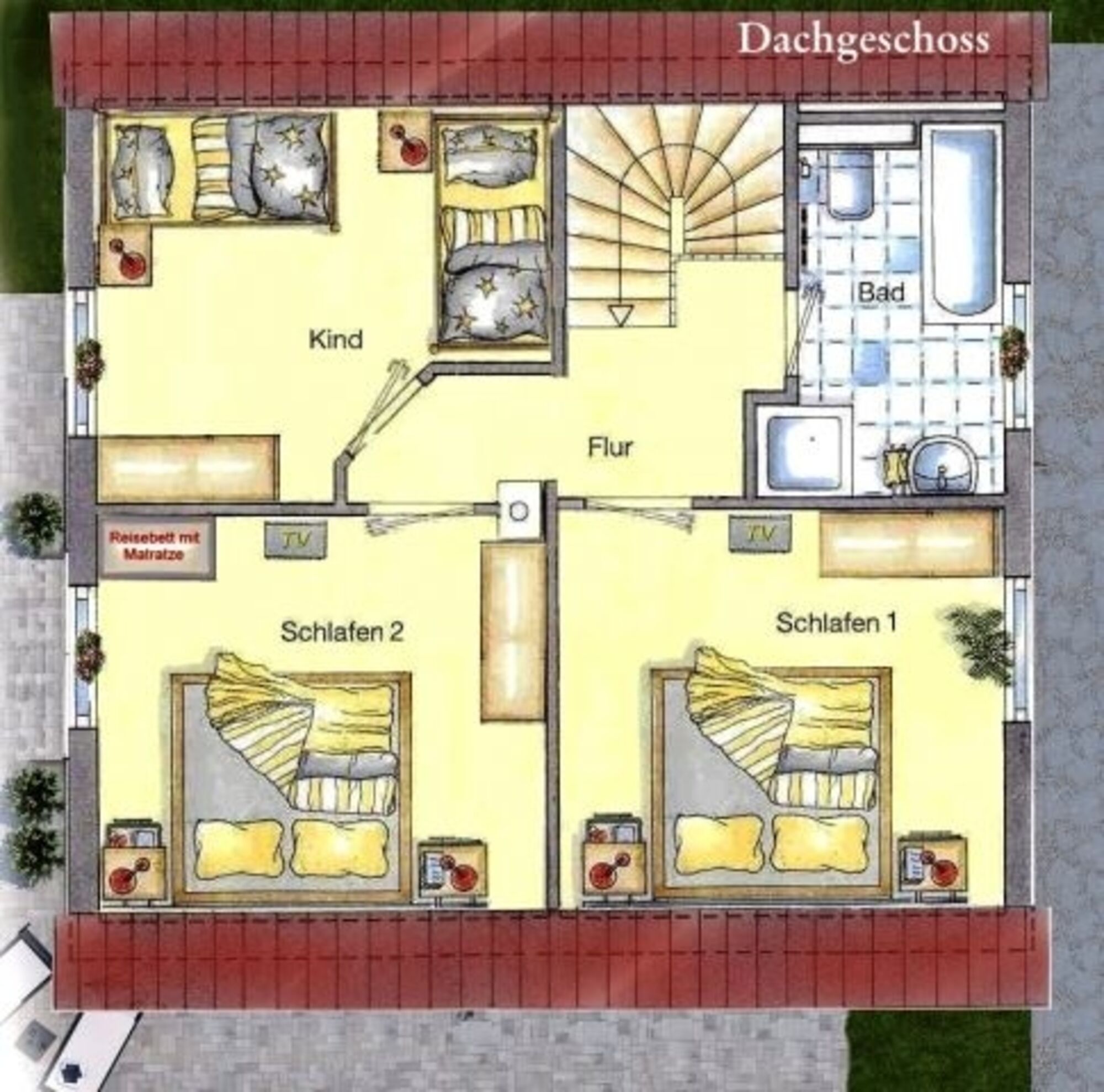 3 Schlafzimmer, die für bis zu 6 Personen ausreichend Platz anbietet. Das Bad ist familiengerecht eingerichtet. Sie haben ein WC, Waschtisch, Dusche und eine Badewanne. Im Erdgeschoss befindet sich ebenfalls noch ein 2 WC.