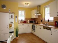 4-Platten Herd, Cerankochfeld, Dunstabzugshaube, Kühlschrank mit Gefrierfach, Gefrierschrank, Senseo-Kaffeeautomat, Tassimo-Kaffeautomat, Eierkocher, Mixer, Korkenzieher / Flaschenöffner, Gewürze (Salz, Pfeffer, Zucker), Geschirrhandtücher, Mülltüten, Essplatz in der Küche