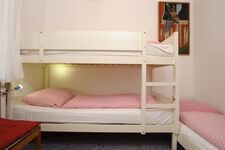 2 Schlafräume: 1 Schlafraum mit 1 Doppelbett, 1 Schlafraum mit 1 Etagenbett und 1 Einzelbett (70 cm breit) (Fußböden: Teppich)