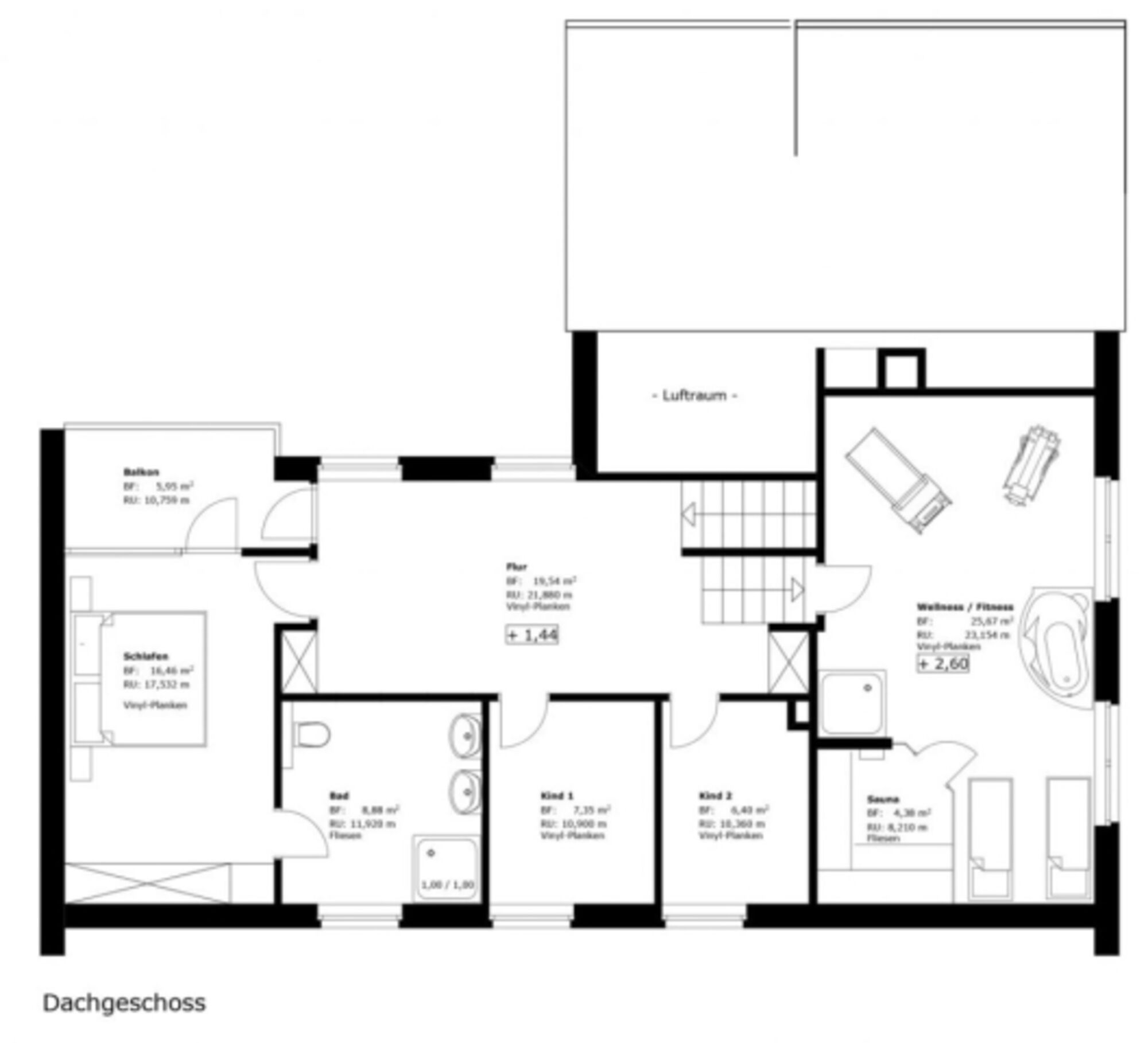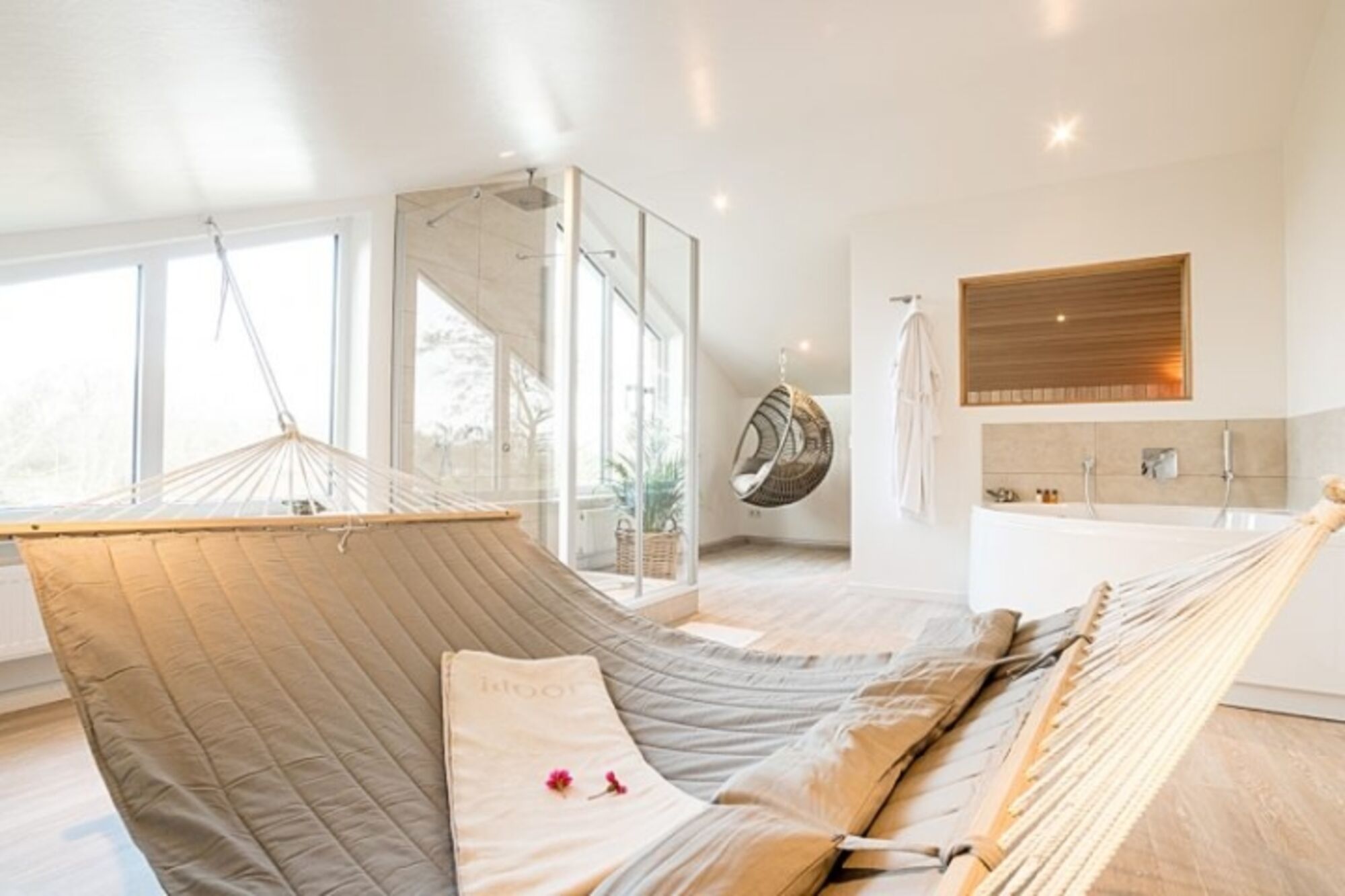 1 Vollbad mit Spa-Bereich (OG): Sauna, Whirlpool (Hot Tube, Jacuzzi) für 2 Personen, Wellness-Dusche für 3 Personen, Kneippschlauch, Fön, Hängematte, Hängesessel