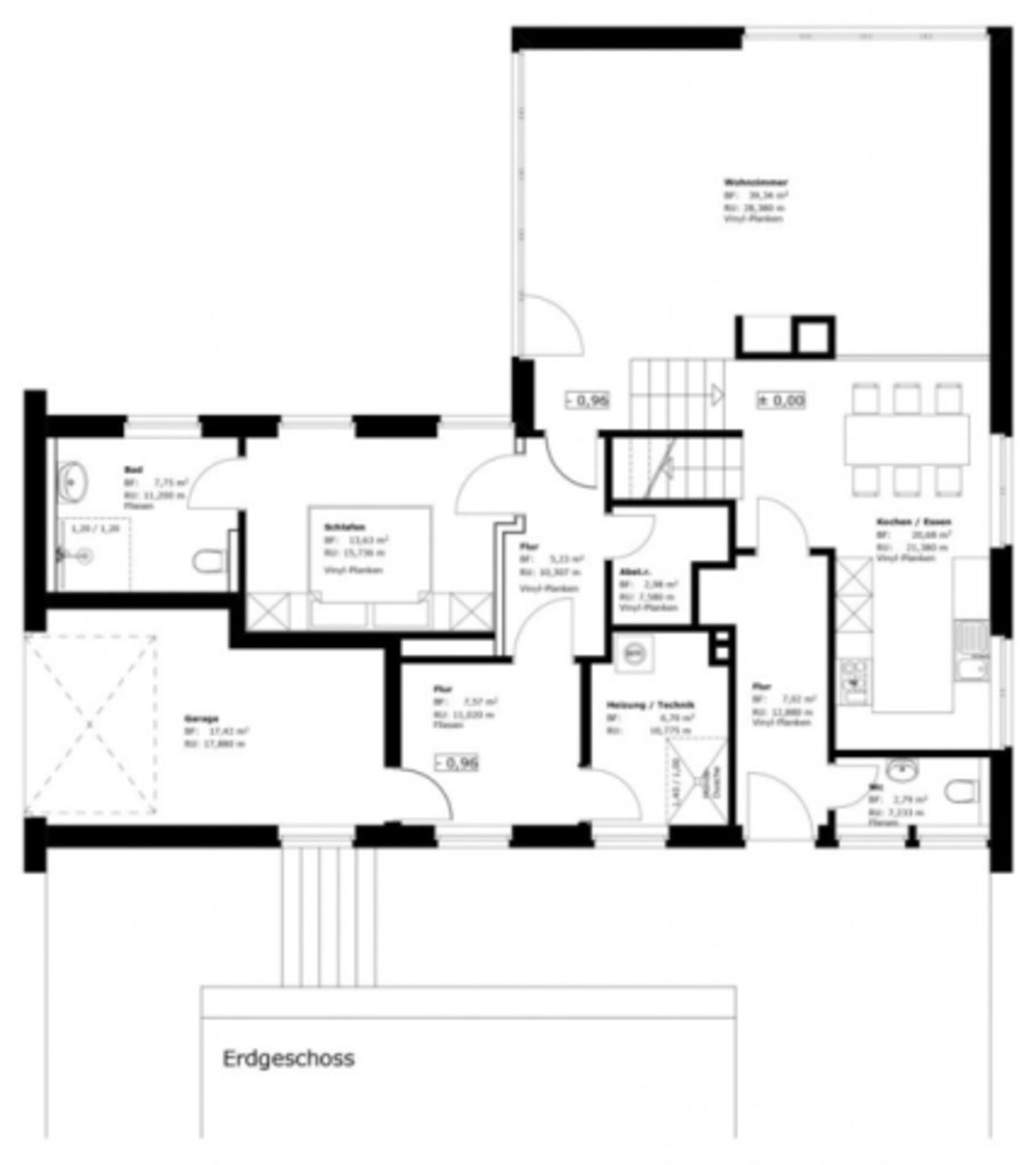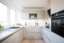 Einbauküche, Induktionsherd (5 Kochfelder), Backofen mit Grill, Umluft und Dampfgarfunktion (Konvektomat), Kühlschrank, Gefrierschrank (48 Liter), Dunstabzugshaube, Weinkühlschrank mit 2 Temperaturzonen, Geschirrspüler, Mikrowelle, Toaster, Eierkocher, Wasserkocher, Kaffeemaschine, Espressomaschine, Elektro-/ Kontaktgrill, Pürierstab, Mixer, hochwertige Ausstattung an Besteck und Gläsern (Fußboden: PVC - Planke)