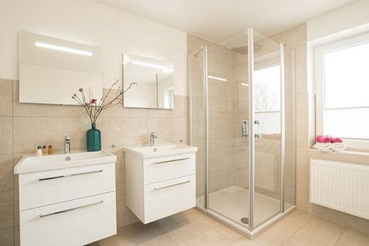 1 Badezimmer (EG): Duschbad en suite mit WC, Kosmetikspiegel
