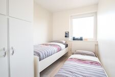 1 Schlafraum (OG) mit 1 ausziehbarem Einzelbett (90 x 200 cm). Verdunklungsplissees, Insektenschutz (Fußböden: PVC-Planken) Einzelbett