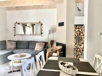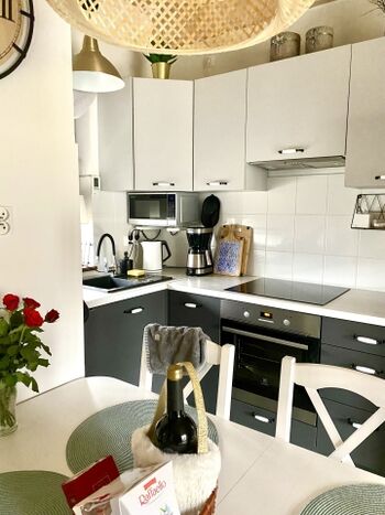 4-Platten Herd, Cerankochfeld, Induktionsherd, Dunstabzugshaube, Kühlschrank mit Gefrierfach, Kaffeevollautomat, Korkenzieher / Flaschenöffner, Gewürze (Salz, Pfeffer, Zucker), Geschirrhandtücher, Mülltüten, Essplatz in der Küche
