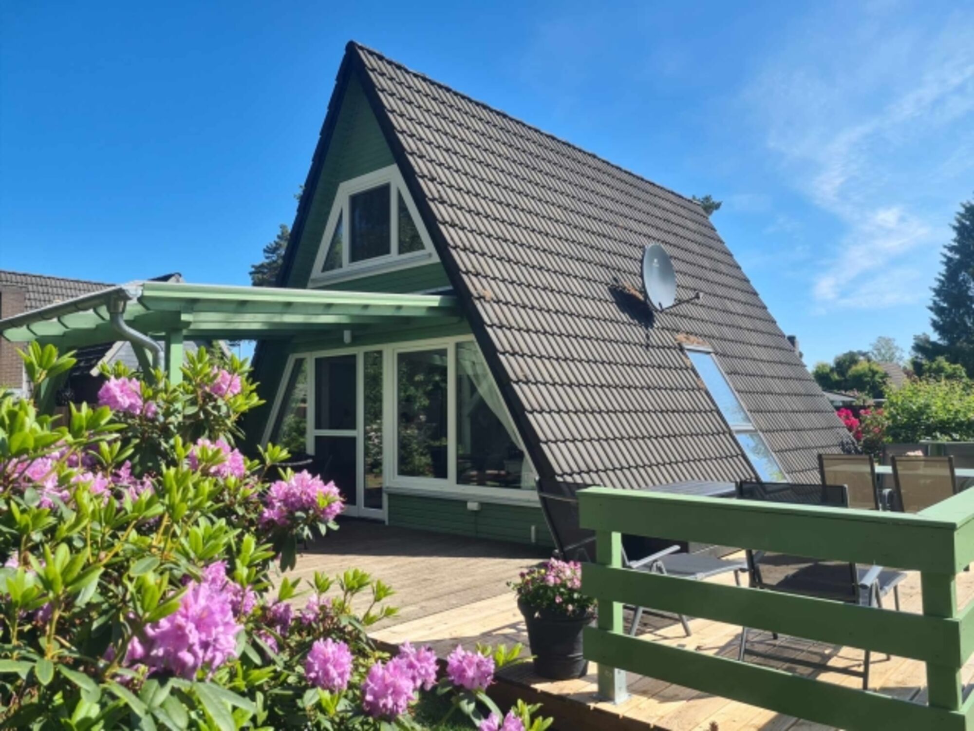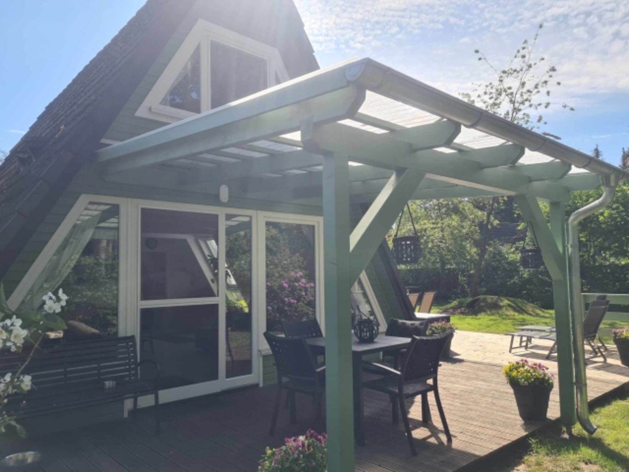 Vom Wohnzimmer und Flur aus gelangst du auf zwei sonnige Holzterrassen, perfekt für Frühstück mit Vogelgezwitscher oder Kaffee im Grünen. Im schattigen Waldteil wartet eine dritte, überdachte Terrasse mit Grill und Feuertonne – ideal für lange Abende bei Kerzenschein und Lagerfeuer.
