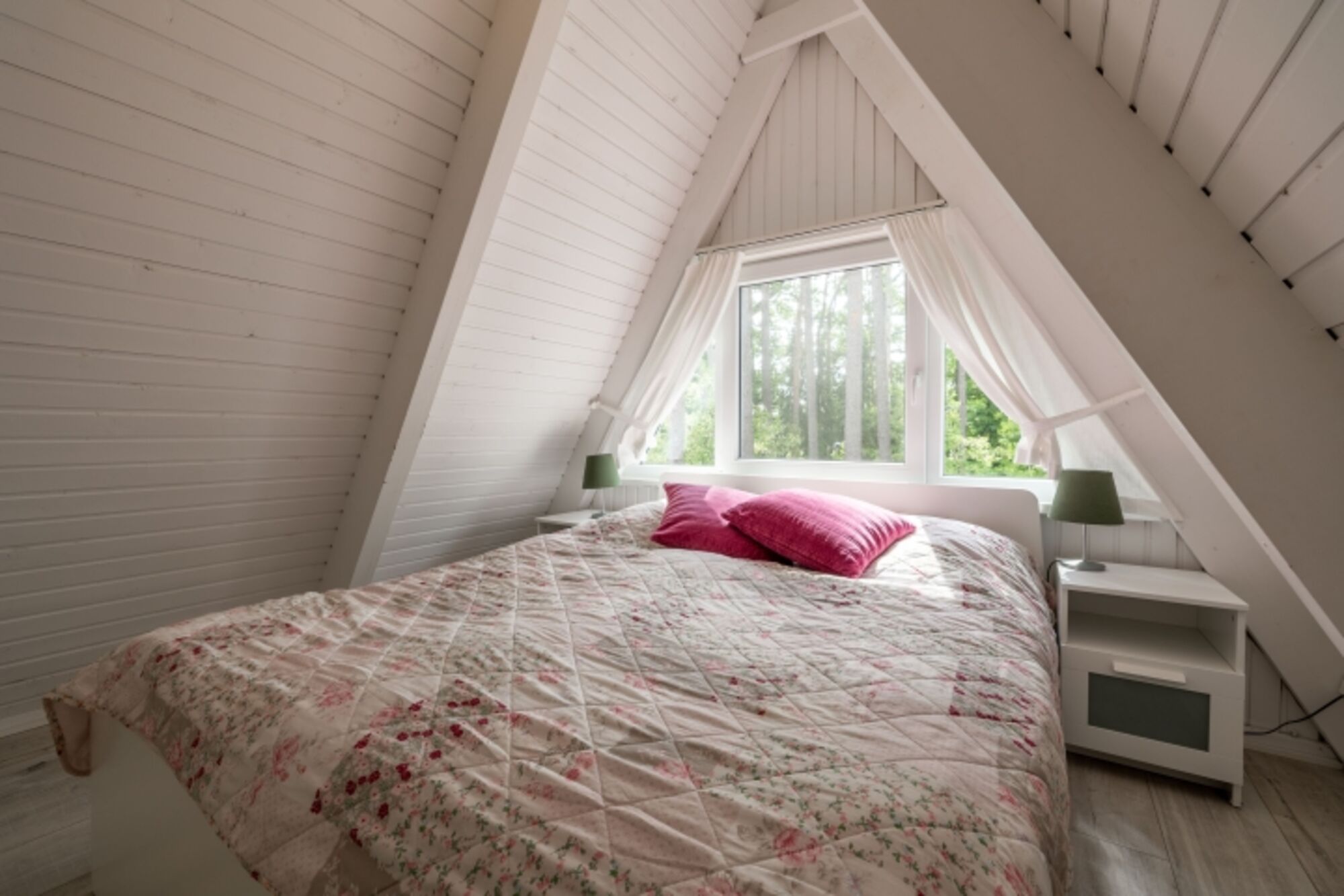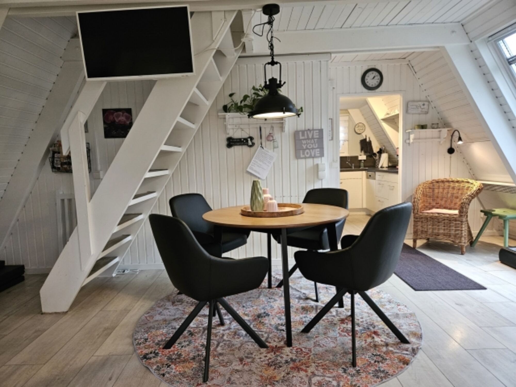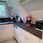 Das Erdgeschoss empfängt dich mit einem gemütlichen Wohnzimmer samt dänischem Kaminofen, einer kleinen, aber voll ausgestatteten Küche und einem modernen Bad mit großer Glasdusche. Über eine offene Holztreppe gelangst du ins Obergeschoss mit zwei charmanten Schlafzimmern im nordisch-gemütlichen Mix aus Shabby- und Factory-Stil.