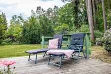 Im Garten findet sich immer ein ruhiges Plätzchen: ob in der Sonne oder im Schatten der alten Kiefern. Und wer richtig entspannen will, schwingt sich in die Hängematte – mitten in der Natur, mitten im Glück.