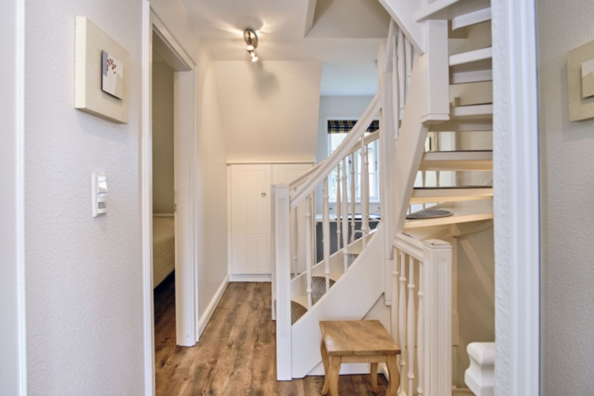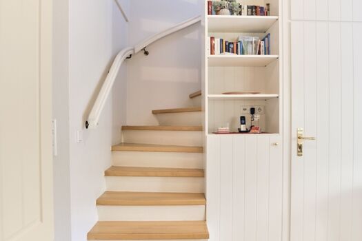 1 geschlossene Holztreppe ins OG, 1 offene Holztreppe mit Teppichbelag ins DG