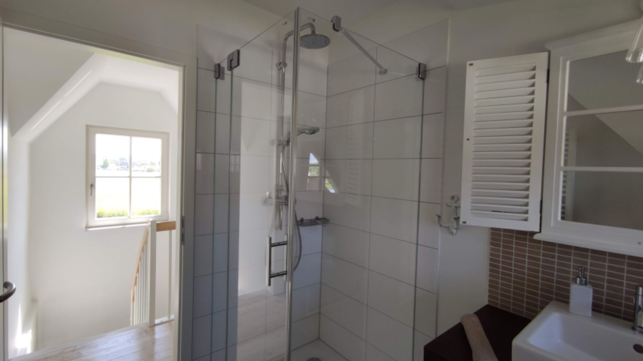 Waschbecken, Regendusche, Spiegel, Fenster im Bad, Fliegengitter