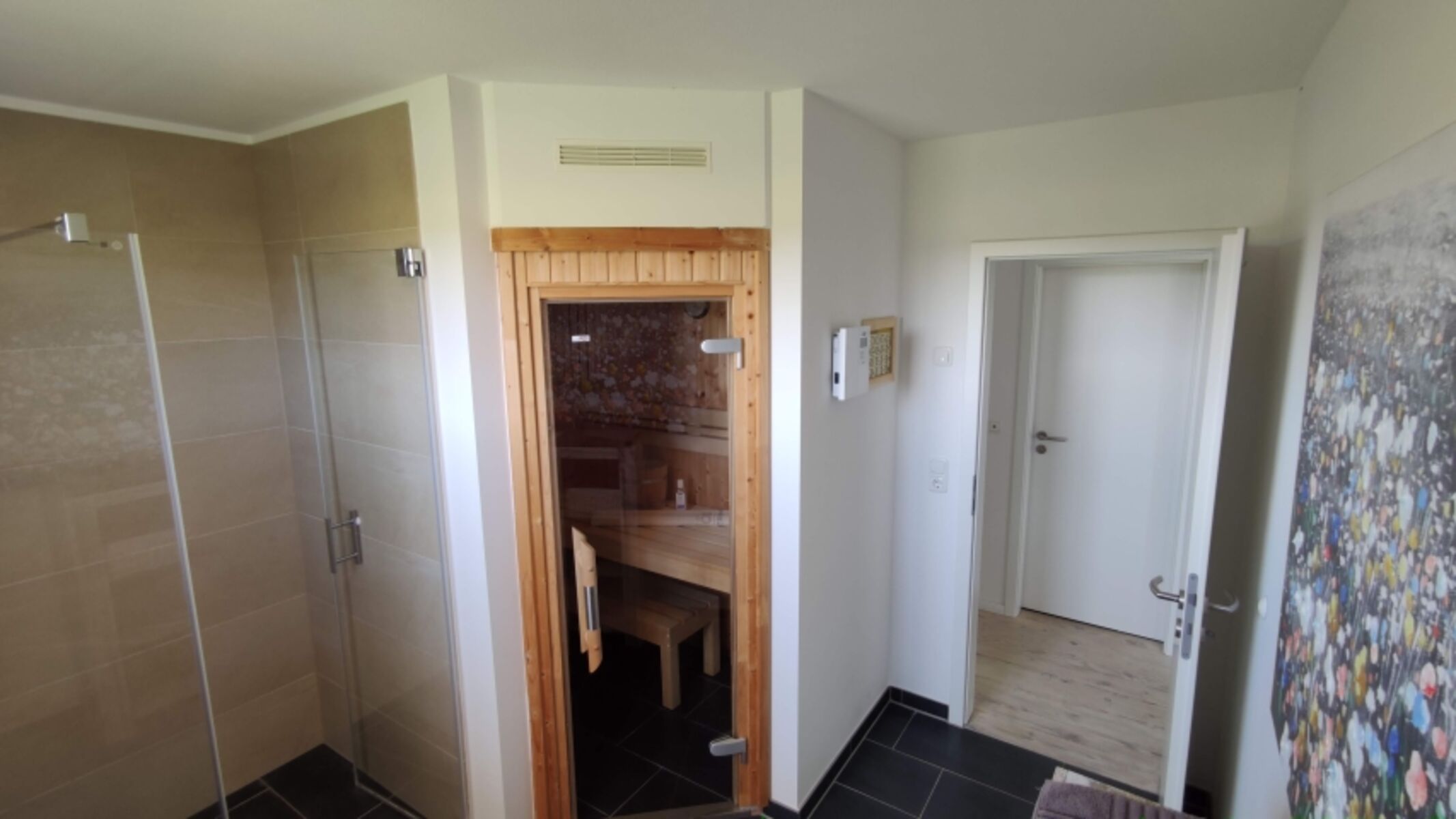 Badezimmer 1: ...befindet sich im OG mit ebenerdiger Dusche, WC und Waschbecken, top-moderne und geschmackvolle Bad-Objekte. Badezimmer 2: ...ist im EG und besteht aus separatem kleinen Gäste-WC (WC plus Waschbecken) und einem Sauna-Raum mit Wellnessdusche und zwei Enstpannungsliegen.... Waschbecken, Massagedusche, Spiegel, Fenster im Bad