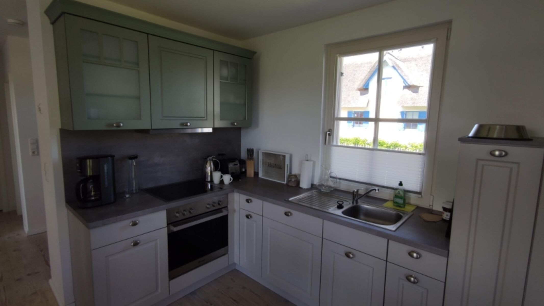 Cerankochfeld, Dunstabzugshaube, Kühlschrank mit Gefrierfach, Senseo-Kaffeeautomat, Korkenzieher / Flaschenöffner, Gewürze (Salz, Pfeffer, Zucker), Geschirrhandtücher, Mülltüten, Essplatz in der Küche, TV in der Küche