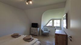 Schlafzimmer 1 / Obergeschoss, links: mit neuwertigem sehr bequemen Boxspringbett 1,80 x 2,00 m. Zwei Kommoden, ein sehr großer hochwertiger Massivholzkleiderschrank befindet sich in Schlafzimmer 2. Ein Sessel zur schnellen Ablage von Kleinigkeiten oder abendlichen Lesen ist vorhanden. Auf einer Kommode befindet sich TV für abendliches Fernsehen aus dem Bett. Abdunkelbar über Raffrollos oder über Außenfensterläden. Insektenschutz vorhanden für beruhigten Schlaf mit offenem Fenster. Doppelbett 1,80 x 2,00m, Boxspringbett, Kommode, Leselampe am Bett, Fliegengitter